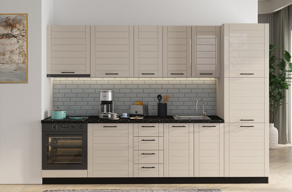La cuisine DRINA en combinaison du décor blanc opaque et de la feuille laquée sable est une solution idéale pour les espaces de cuisine modernes. Grâce à sa conception minimaliste et à ces lignes épurées, ainsi qu’à ses tons neutres, elle s’intègre facilement dans divers styles d’intérieurs, apportant à l’espace une sensation d’ordre, de luminosité et d’harmonie. Sa fonctionnalité est soigneusement pensée – les éléments hauts fermés contribuent à l’aspect minimaliste et harmonieux, tandis que les segments bas dotés de tiroirs permettent une organisation simple et efficace des ustensiles de cuisine. L’option d’installer un évier, un four et une hôte aspirante contribue davantage à une planification rationnelle de l'espace, et la conception modulaire permet de combiner différents éléments pour une fonctionnalité optimale.