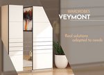 La collection de placards VEYMONT constitue une solution de conception élégante et très attrayante dont l’esthétique prononcée contribue à l’impression d’ambiance générale. Cinq modèles de placards VEYMONT ont été présentés, de largeurs différentes, au décors blanc opaque et chêne artisan. Tous les modèles disposent d’un miroir sur l’une des façades. Dans leur forme de base, les placards VEYMONT ne disposent que de barres de garde-robe pour ranger les vêtements suspendus, mais on a également présenté des ensembles d'étagères supplémentaires, si un mode de rangement différent est nécessaire.