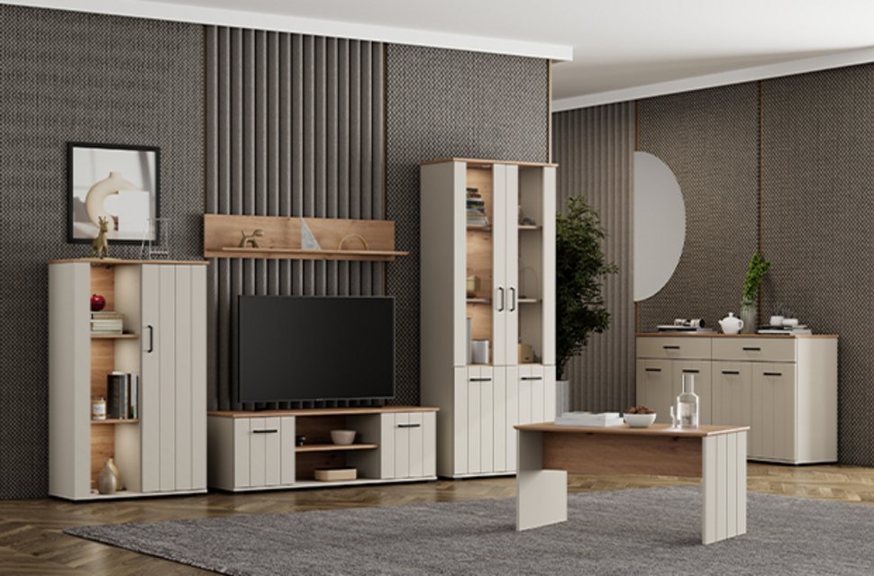 Le système d’éléments LAMBETH pour l’aménagement du salon constitue une solution esthétiquement attrayante et à fort effet d’ambiance. La combinaison dominante des décors cachemire et chêne artisan apporte à l’espace la chaleur, tandis que la finition spéciale en forme de rayures en relief sur les façades apporte une touche rustique et souligne davantage le style de ce système.