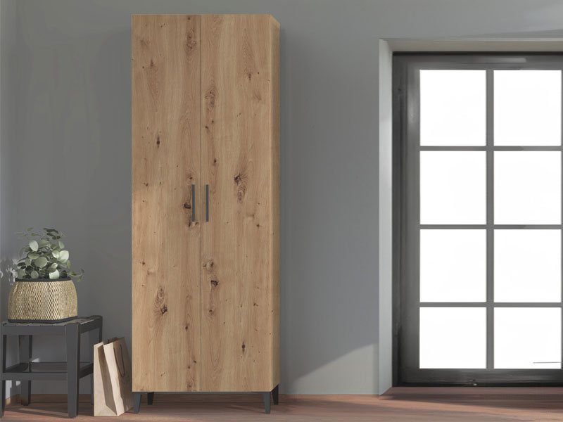 L’armoire à chaussures BUSETO 2K, au décor chêne artisan, est une solution très pratique, et grâce à ses étagères fermées pour ranger les chaussures, elle offre la possibilité d’une organisation fonctionnelle de l’entrée.