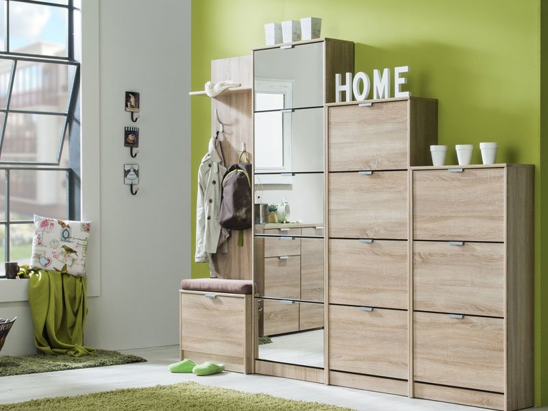 L’armoire à chaussures HUGO 25 OG, en combinaison de miroir et de corps au décor chêne sonoma, dispose de cinq segments pour ranger les chaussures de saison, et grâce à ses dimensions et à une organisation à deux rangs, elle représente une solution très remarquable fonctionnelle pour l'aménagement d’une entrée de plus petites dimensions.