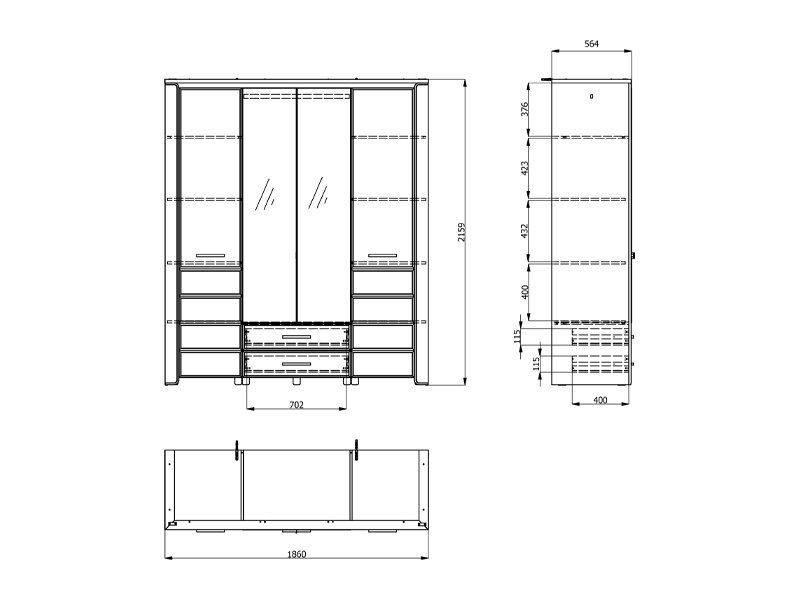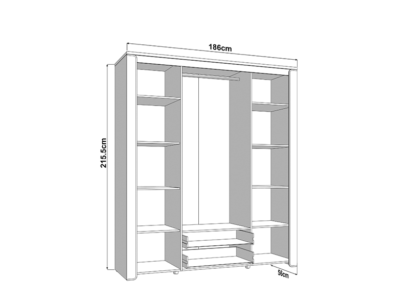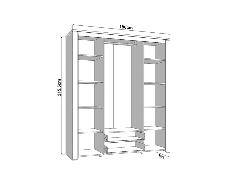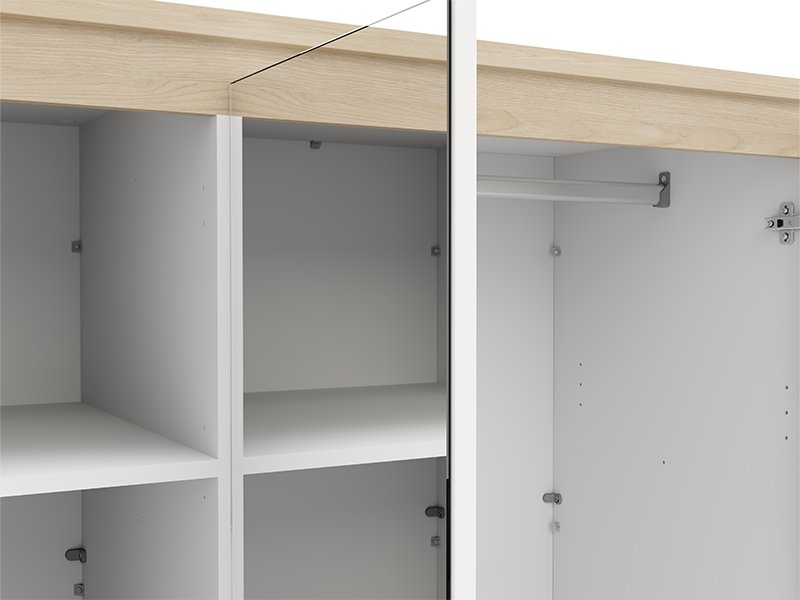 Les deux façades centrales de l’armoire sont dotées d’un miroir, et l’espace utilisable de cette partie comporte une barre de garde-robe et deux tiroirs, ce qui permet un rangement bien organisé et pratique des vêtements et des petits objets. Les segments cloisonnés gauche et droite de l’armoire fournissent un espace supplémentaire pour l’organisation des vêtements.