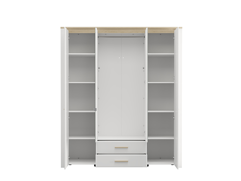 "L’armoire ABERDEEN 4K2F2O h216, fabriquée en combinaison des décors blanc opaque, chêne pédonculé clair et de la feuille laquée blanche, contribue à l’aspect moderne et élégant de la chambre à coucher, tout en soulignant le contraste des matériaux et la forme géométrique précise de la conception.
