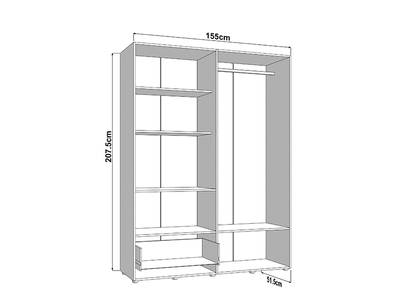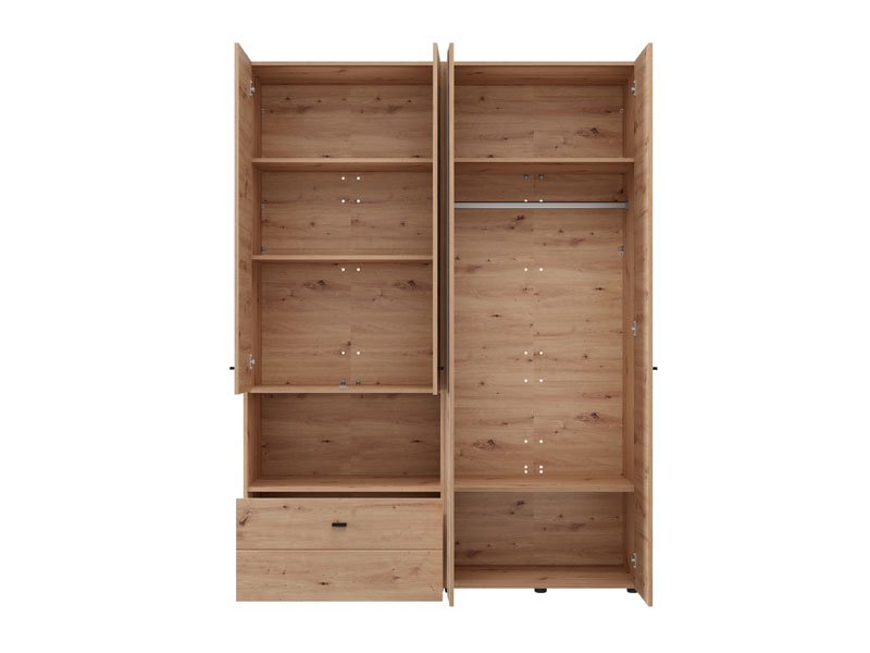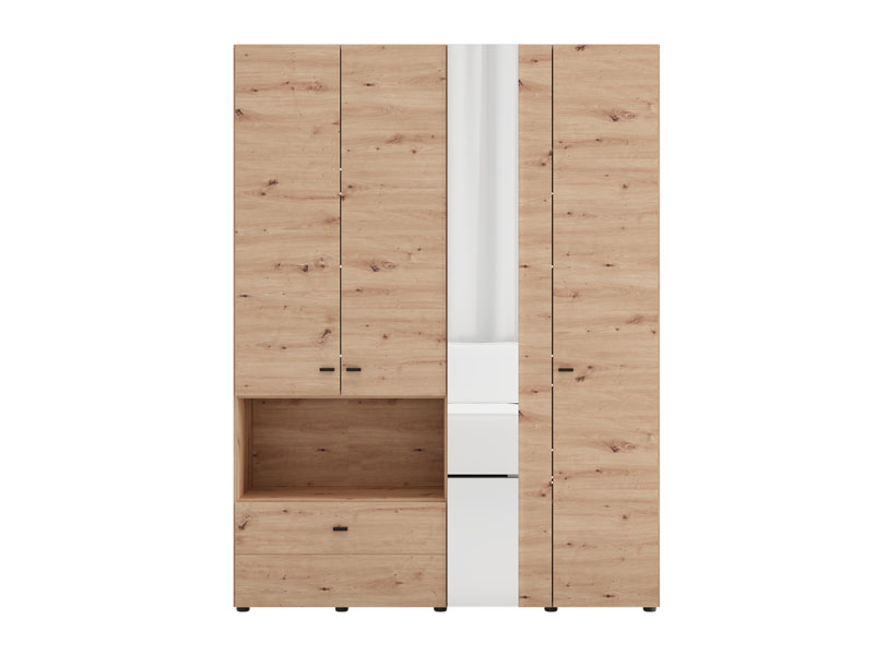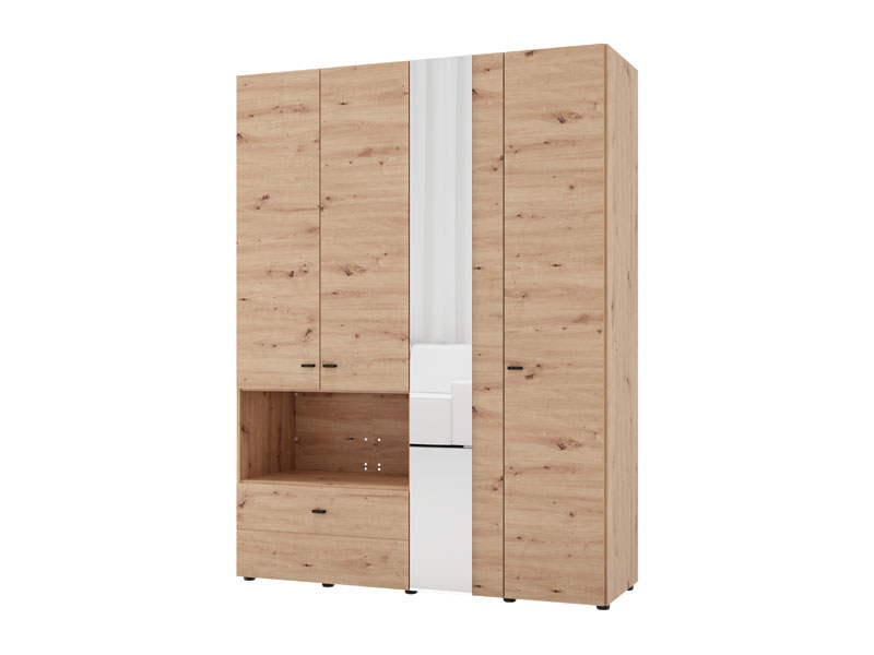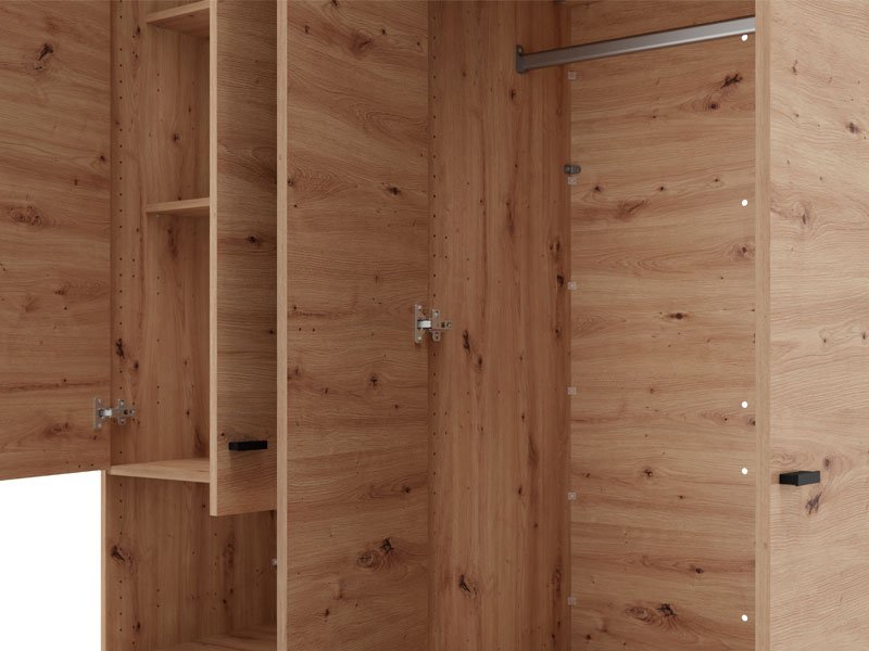 L’armoire CAMPSIE 4K1F1O h207, au décor chêne artisan, est une solution élégante et moderne pour l’organisation des vêtements. Cette armoire à quatre battants comporte un segment à double battant avec des étagères, une étagère ouverte et un tiroir profond, tandis que l’autre segment à double battant comporte une barre de garde-robe. Un battant de l’armoire est doté d’un miroir, ce qui contribue à la fonctionnalité, mais également à l’esthétique de l’espace. Il est possible d’élargir davantage l’espace utilisable en ajoutant un ensemble d’étagères, améliorant ainsi la fonctionnalité de l’espace intérieur.