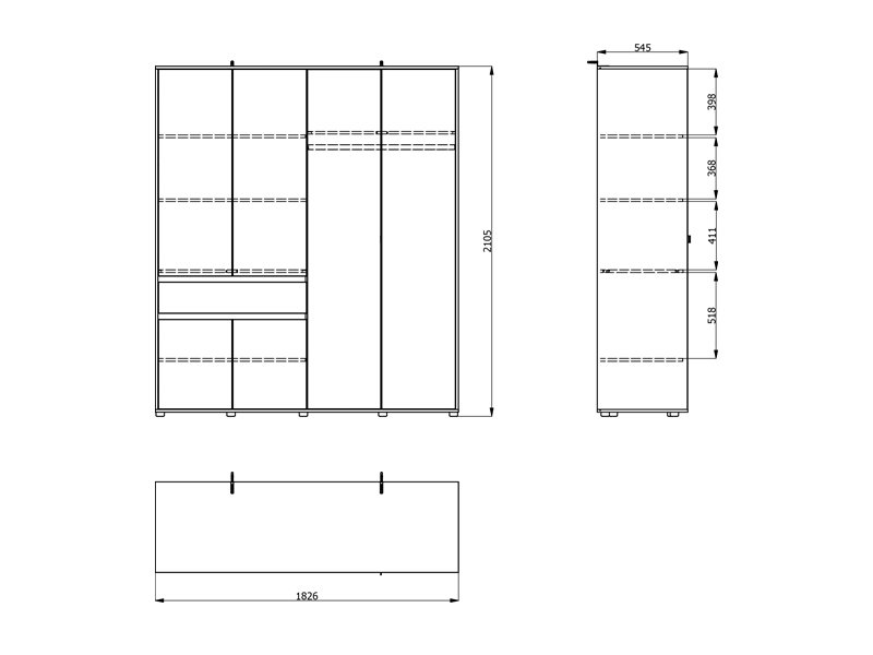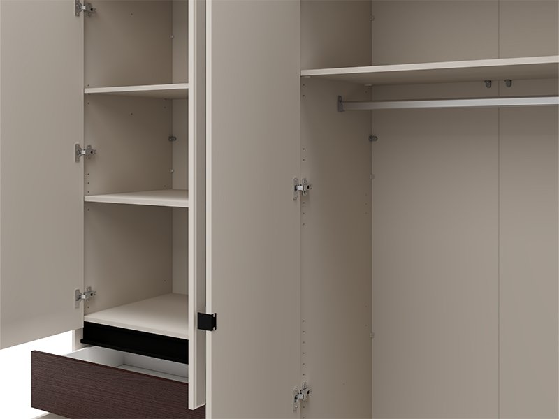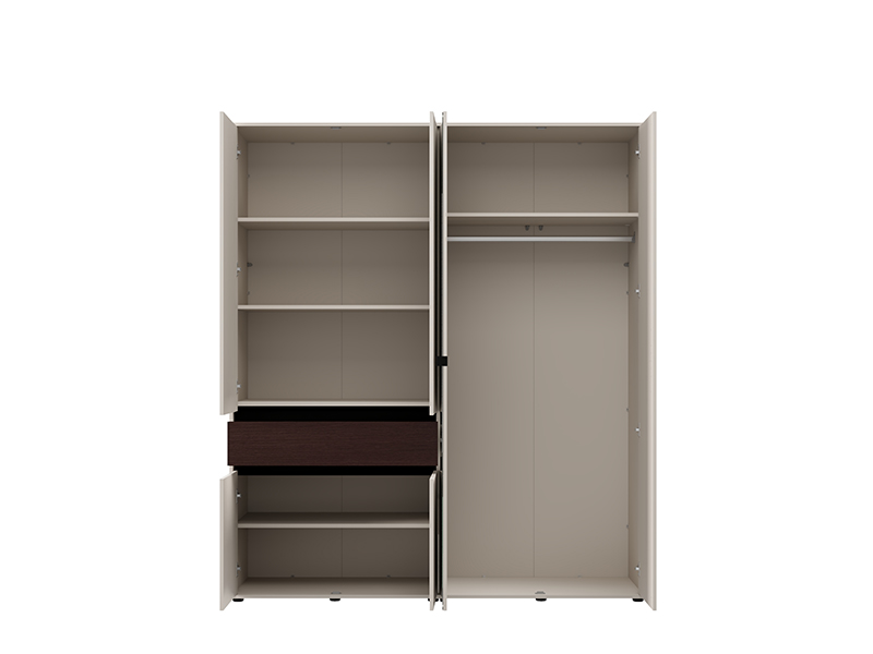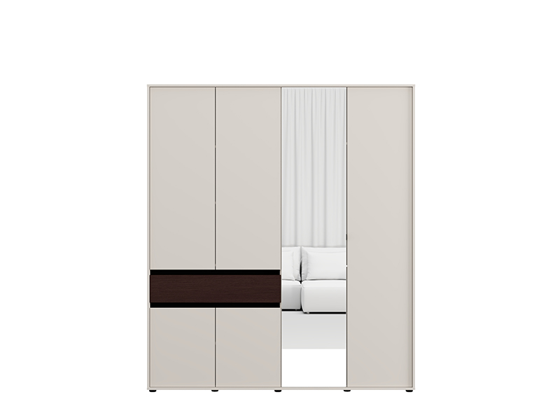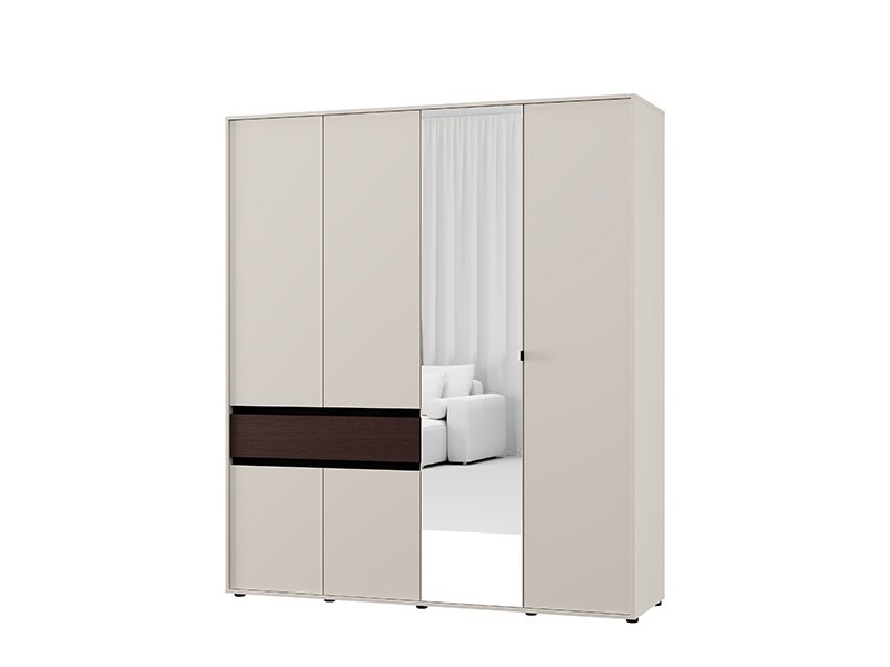 Cette armoire à quatre battants est dotée d’une partie comportant une barre de garde-robe, d’un segment cloisonné fermé et d’un tiroir, tandis qu’une façade comporte un miroir, ce qui améliore la fonctionnalité et agrandit visuellement l’espace.