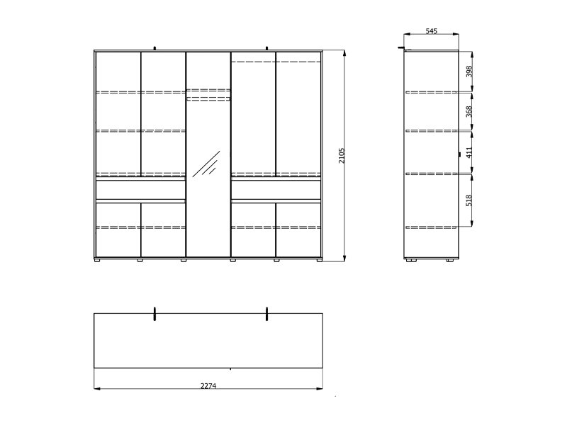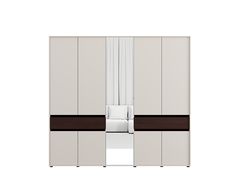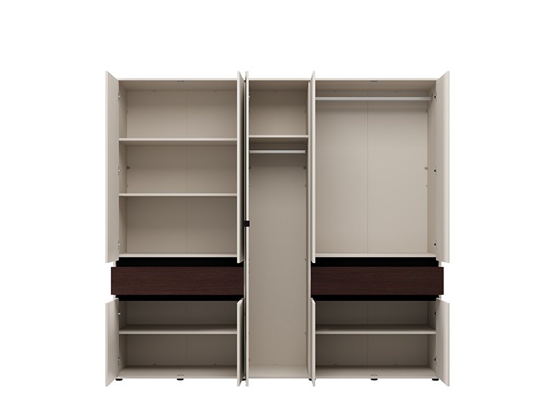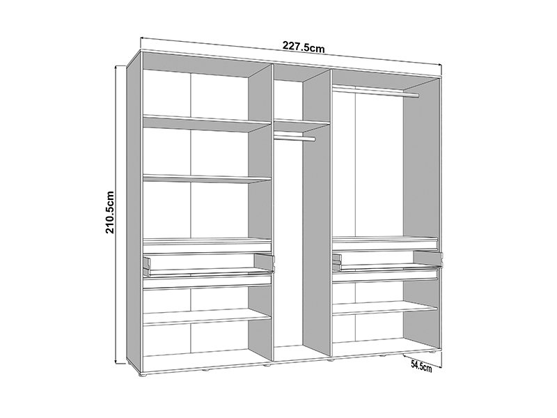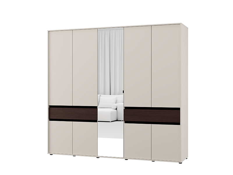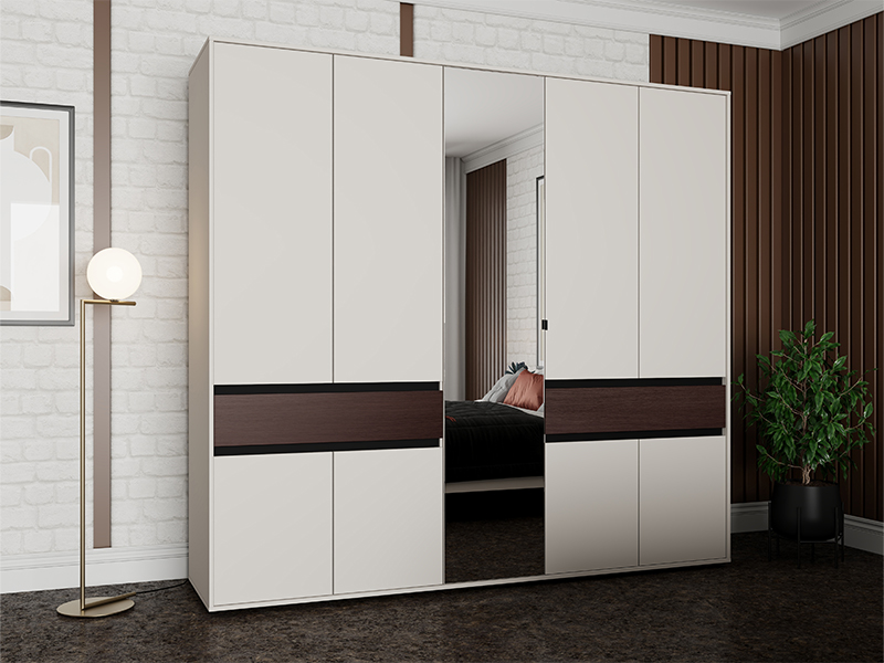 Cette armoire à cinq battants est dotée d’une façade centrale comportant un miroir, tandis que l’espace utilisable se compose de barres de garde-robe et de segments cloisonnés, avec deux tiroirs pratiques, ce qui permet un rangement bien organisé et fonctionnel des vêtements et des petits objets.