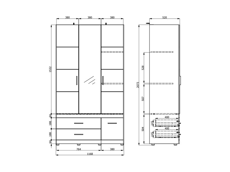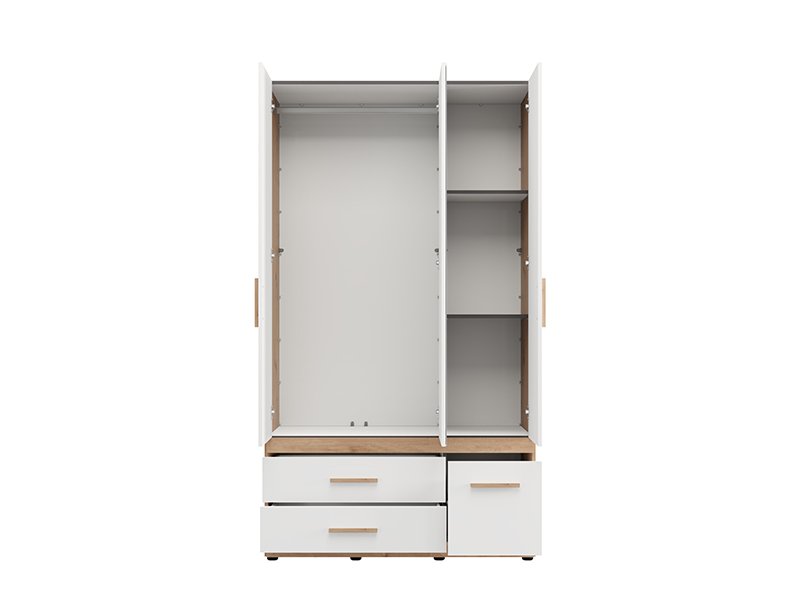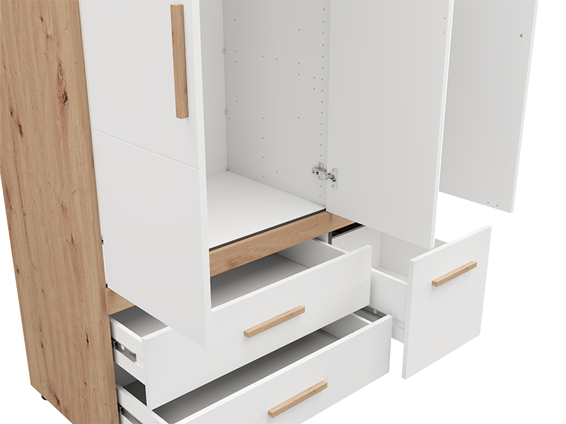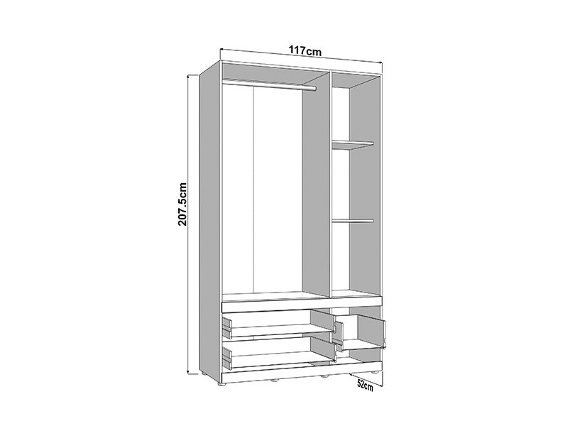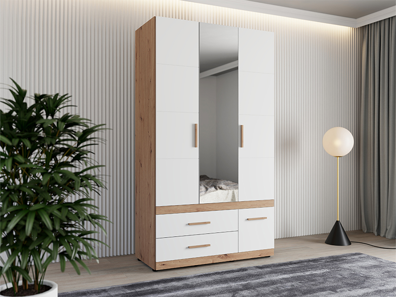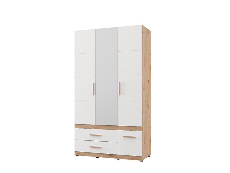 L’armoire DILLON 3K3F1O h207, en combinaison de décor chêne artisan et blanc opaque, est une solution fonctionnelle et moderne pour l’organisation des vêtements. Cette armoire à trois battants comporte un segment à double battant avec une barre de garde-robe, sous lequel se trouvent deux tiroirs spacieux, tandis que le segment à unique battant comporte des étagères et, en dessous, un tiroir profond. La façade centrale est dotée d’un miroir, ce qui contribue à la fonctionnalité et à l'esthétique de l’espace. Il est possible d’élargir davantage l’espace utilisable en ajoutant un ensemble d’étagères, améliorant ainsi la fonctionnalité de l’armoire.