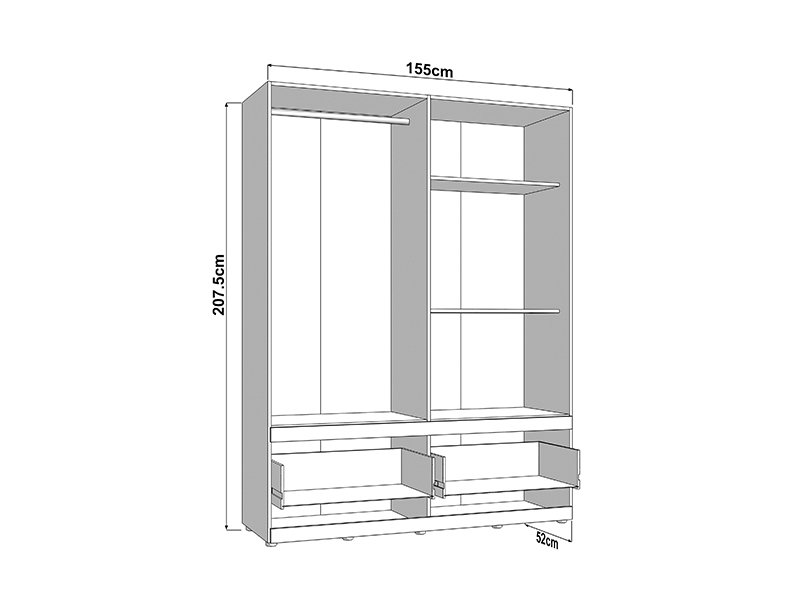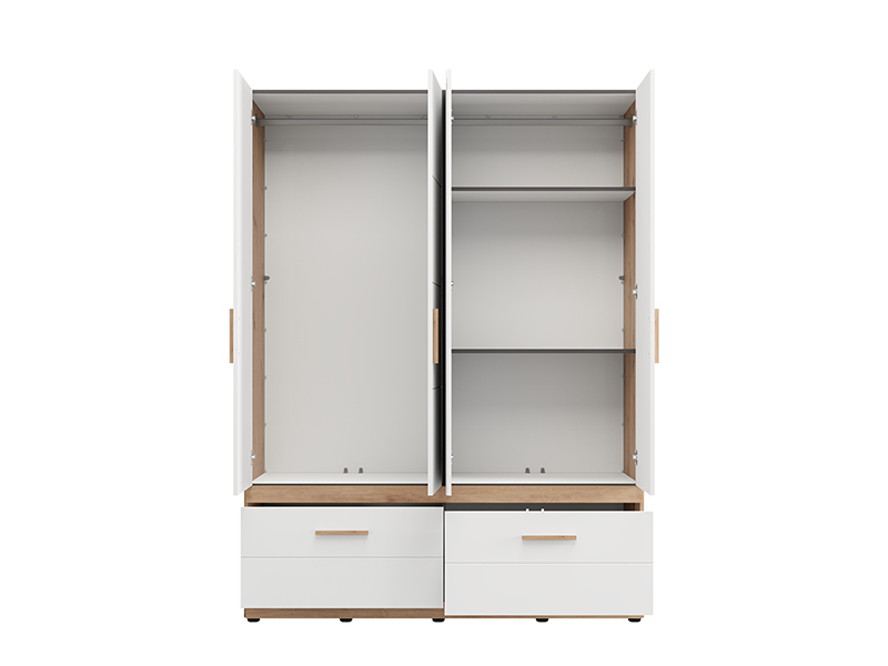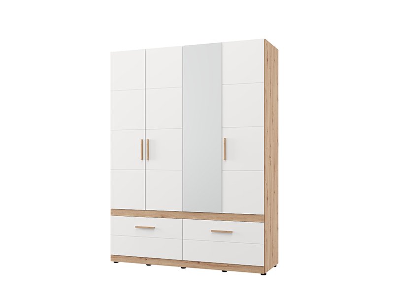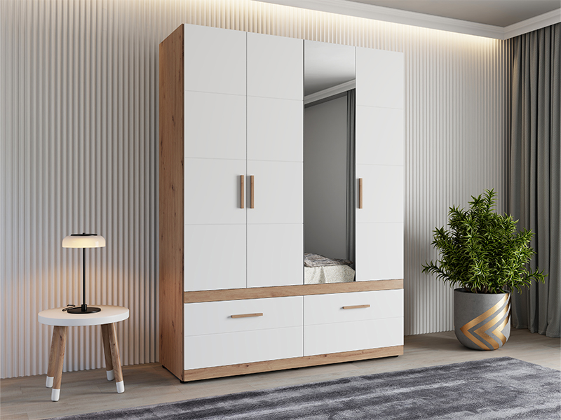 L’armoire DILLON 4K2F1O h207, en combinaison de décor chêne artisan et blanc opaque, est une solution fonctionnelle et moderne pour l’organisation des vêtements. Son espace utilisable comporte deux segments à double battant - un segment avec une barre de garde-robe, et l’autre doté des étagères. Sous les segments fermés se trouvent deux tiroirs profonds et spacieux, permettant ainsi une organisation claire et pratique des vêtements et des accessoires. Une façade est dotée d’un miroir, ce qui contribue à la fonctionnalité et à l'esthétique de l’espace. Il est possible d’élargir davantage l’espace utilisable en ajoutant un ensemble d’étagère pour une fonctionnalité encore plus grande.