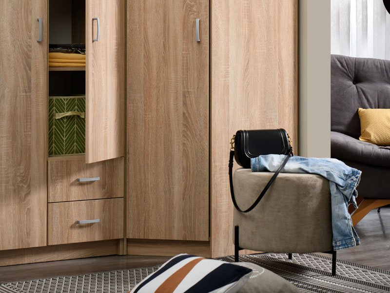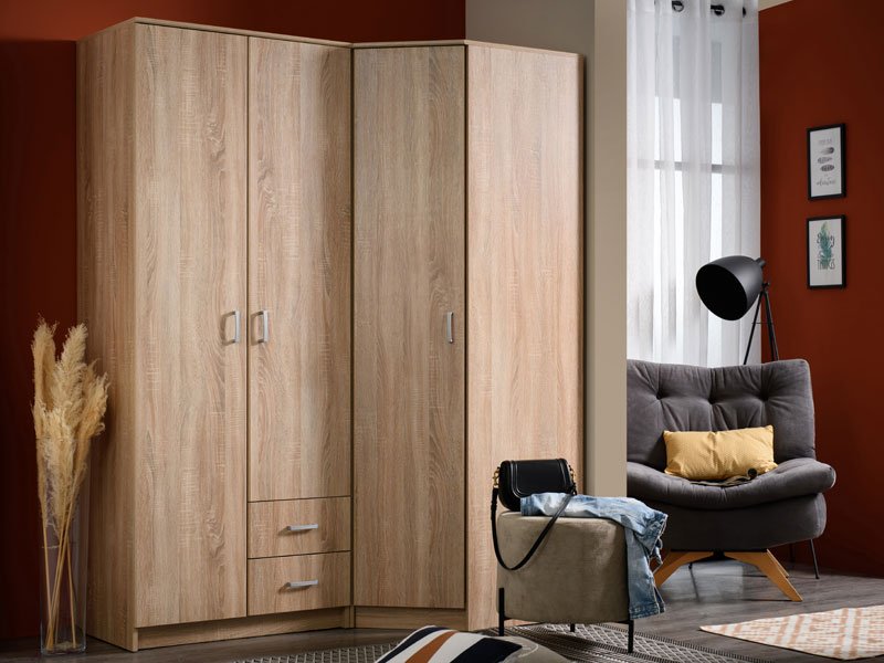 Le modèle fonctionnel d’armoire HANA UGAONI, au dessein chêne sonoma, rationalise efficacement l'espace d'angle à l'intérieur destiné au rangement des vêtements. L'espace organisé avec succès de l’armoire HANA UGAONI se compose d’étagère et d’une barre de garde-robe.