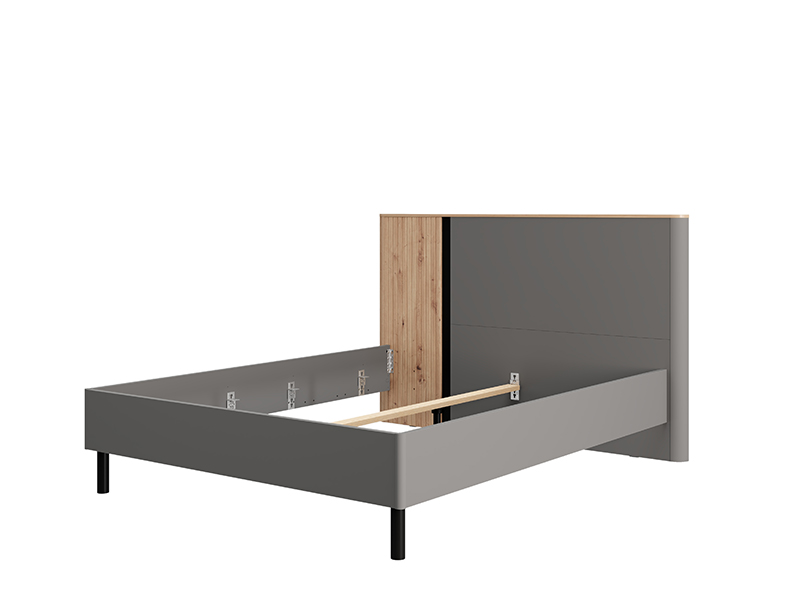 "Le lit double SINOP 180, fabriqué en combinaison du décor chêne artisan, de la feuille chêne artisan, des décors gris graphite et bois noir, contribue à l’aspect moderne et sophistiqué de la chambre à coucher, soulignant le contraste et la ligne de la conception géométrique clairement définie.