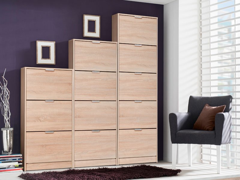 L’armoire à chaussures BASE 15, au dessein chêne sonoma, dispose de cinq étagères pour ranger les chaussures de saison, et grâce à ses dimensions, représente une solution fonctionnelle pour l'aménagement d’une entrée de plus petites dimensions.