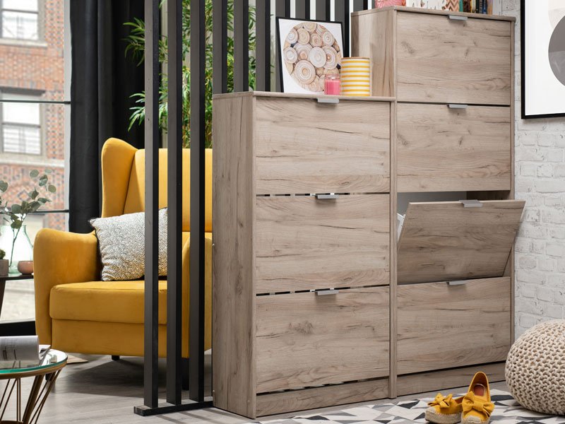 L’armoire à chaussures HUGO 23, au décor chêne gris dispose de trois segments pour ranger les chaussures de saison, et grâce à ses dimensions et à une organisation à deux rangs, elle représente une solution très remarquable fonctionnelle pour l'aménagement d’une entrée de plus petites dimensions.