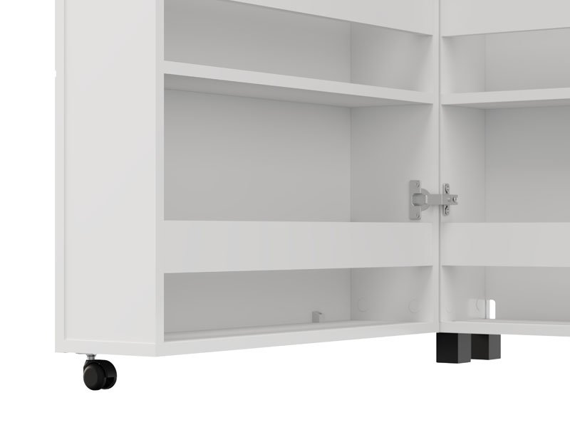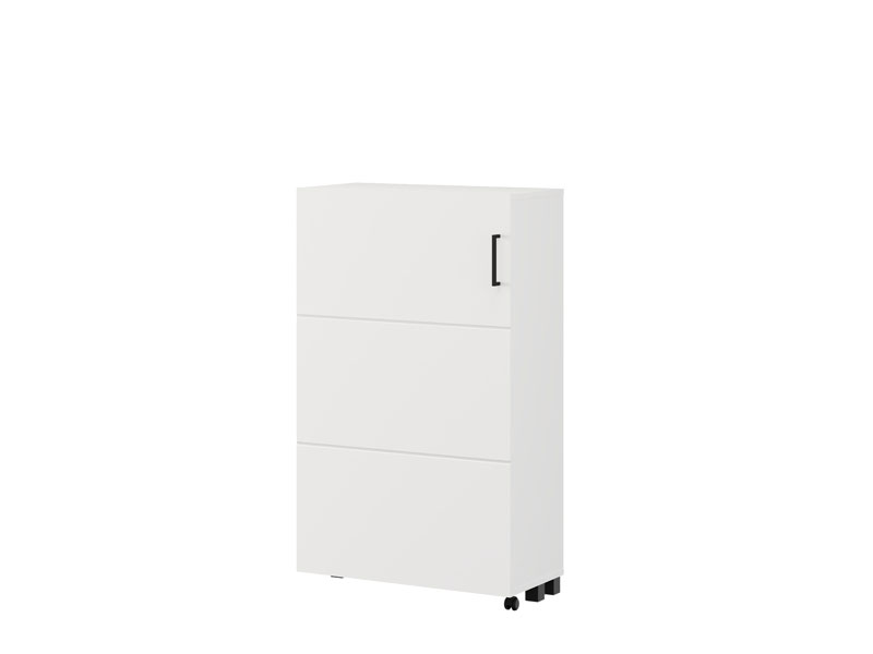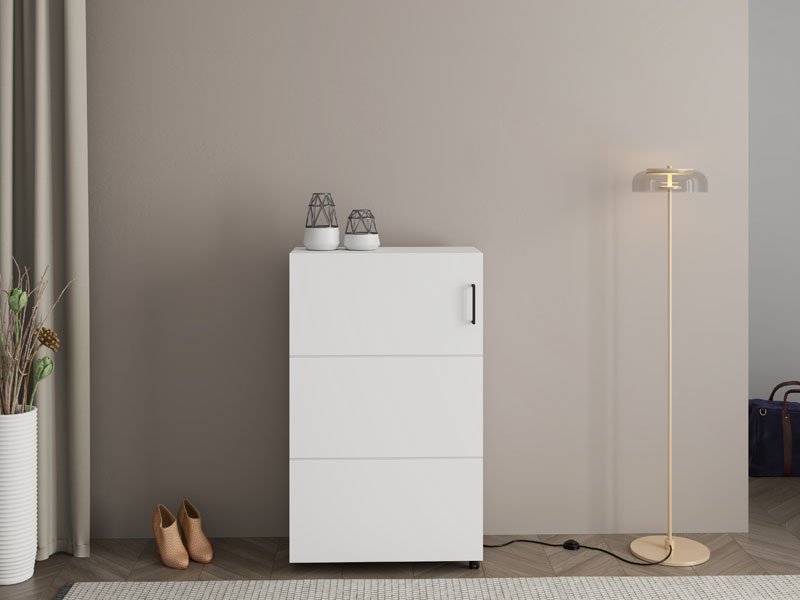 Le meuble à chaussures ISLAY 91 2K h113, au décor blanc opaque avec des rayures marquées à chaud, est une solution pratique et élégante pour le couloir. L’intérieur de ce meuble à chaussures à unique battant, semblable à une commode avec des étagères fermées, permet une organisation rangée et fonctionnelle des chaussures.