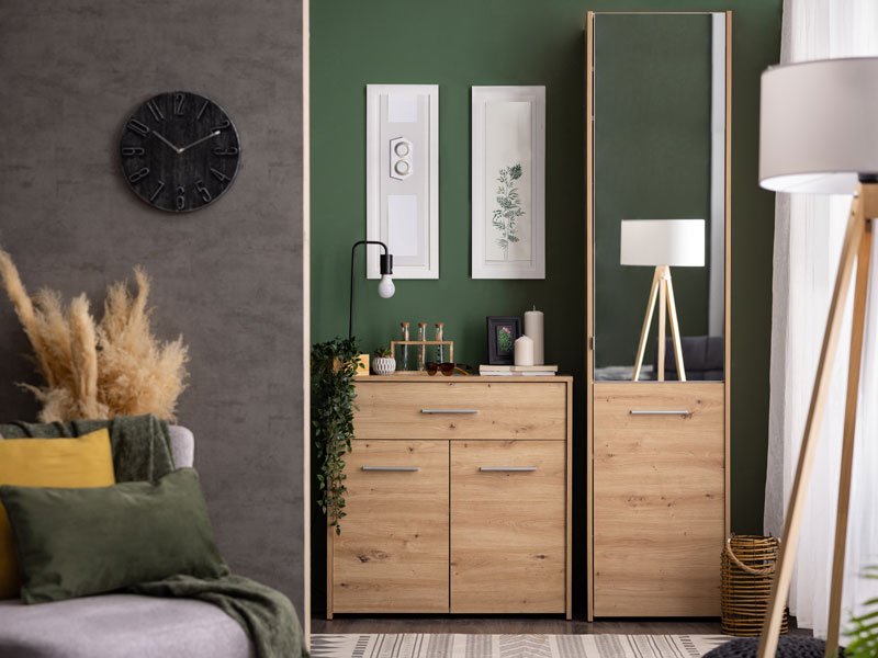 Le modèle d’armoire à chaussures MENORICA 1K OG, au décor chêne artisan, est enrichi par un miroir pratique dans le segment supérieur de l’élément. Dans l’intérieur se trouvent des étagères fermées pour ranger les chaussures, offrant la possibilité d’une organisation rationnelle de l’entrée.