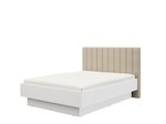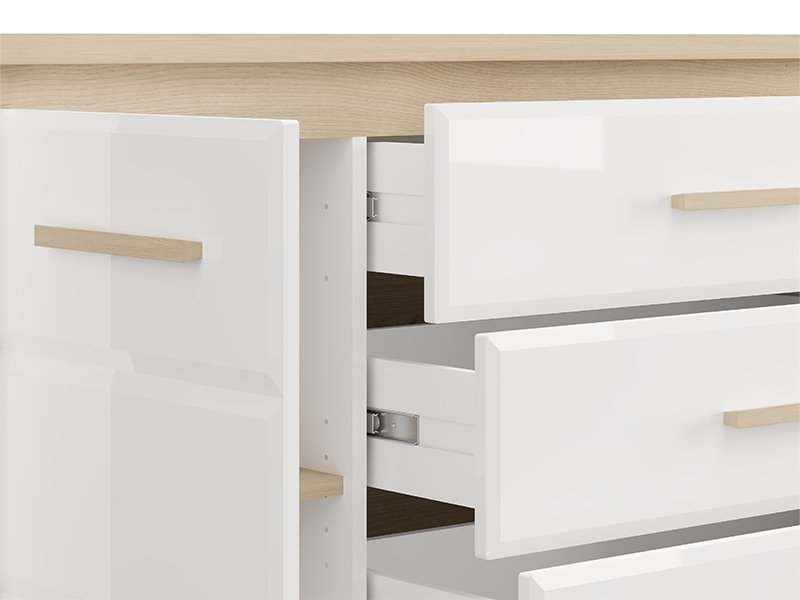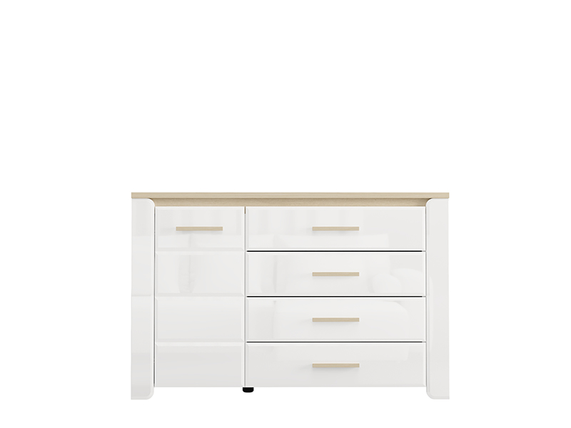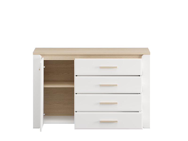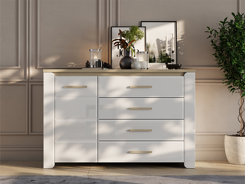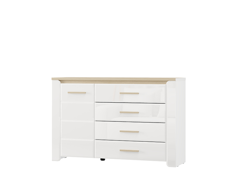 "La commode ABERDEEN 135 2K4F1V, fabriquée en combinaison des décors blanc opaque, chêne pédonculé clair et de la feuille laquée blanche, contribue à l’aspect moderne et élégant de la chambre à coucher, tout en soulignant le contraste des matériaux et la forme géométrique précise de la conception.