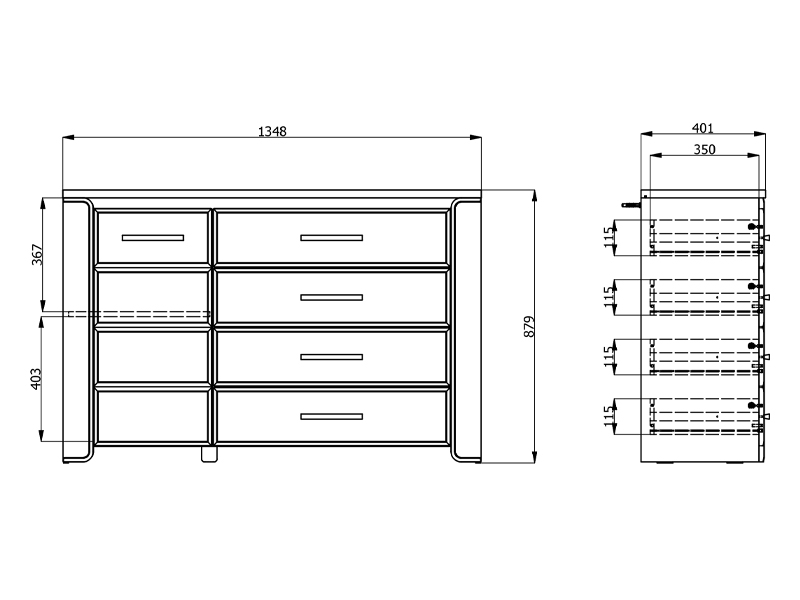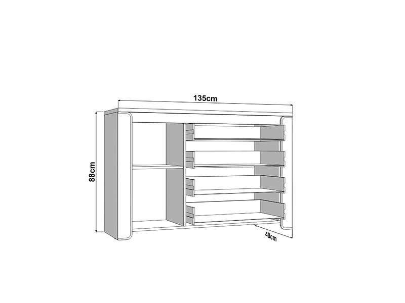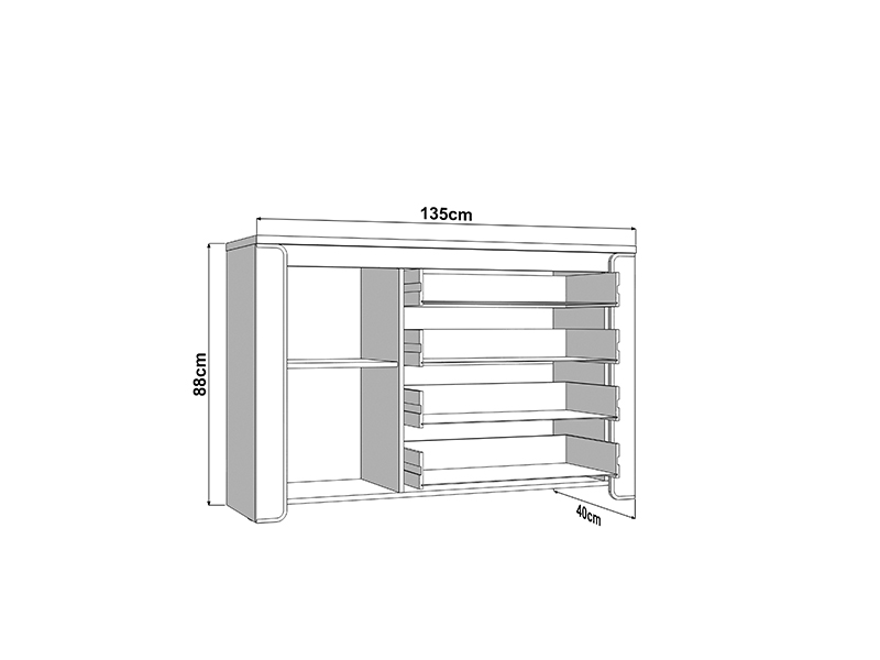 L’espace utilisable de cette commode se compose d’un segment cloisonné fermé et de quatre tiroirs, ce qui permet un rangement bien organisé et pratique des vêtements et des petits objets.