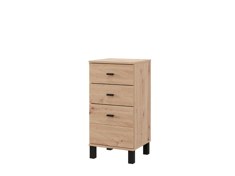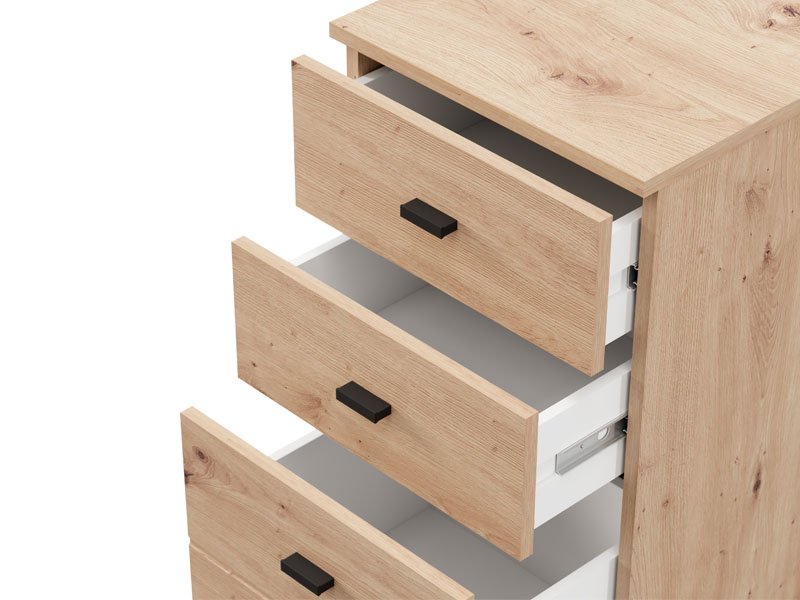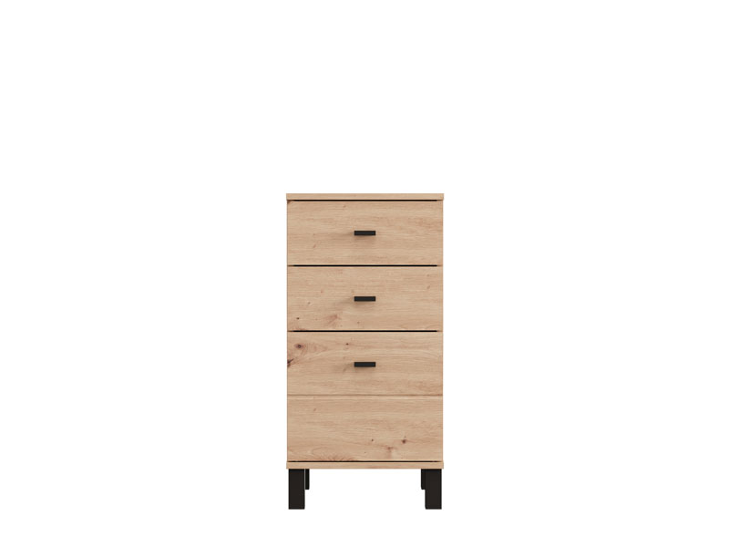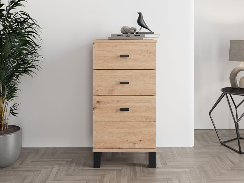La commode ALMOND 38 3F au décor chêne artisan, est un modèle de commode étroite apportant la chaleur et l’ambiance agréable à l’espace, avec un espace utilisable fonctionnel grâce à trois tiroirs, dont un plus profond. Elle est idéale comme meuble d’appoint dans un couloir, un salon, une chambre à coucher ou une chambre d’enfants, alliant la fonctionnalité et la chaleur de l’intérieur.