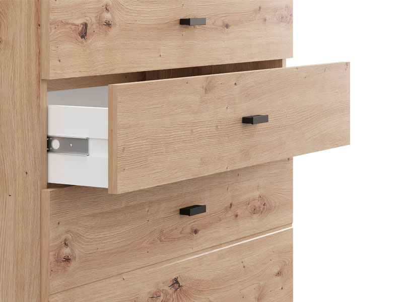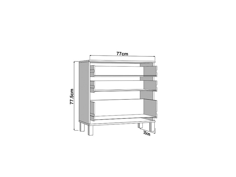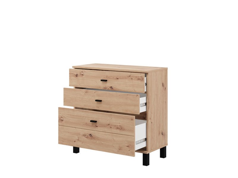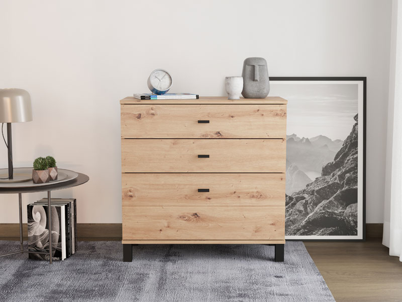 La commode ALMOND 77 3F, au décor chêne artisan, apporte la chaleur et l’ambiance agréable à l’espace, grâce à une conception simple et fonctionnelle. Son espace utilisable se compose de trois tiroirs, dont un profond, destiné au rangement des objets plus volumineux, tandis que les deux autres conviennent aux objets plus petits. Grâce à ses dimensions compactes et à son esthétique naturelle du décor bois, la commode ALMOND 77 3F est un choix pratique pour meubler une chambre à coucher, un couloir ou un petit salon.