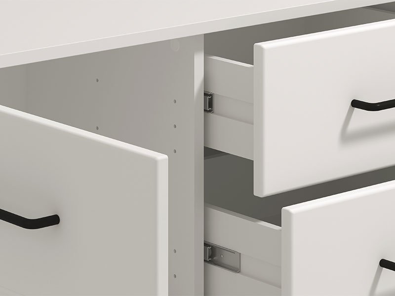 La commode VIENNE 4K2F en combinaison de décor blanc opaque et feuille mate blanche est un meuble fonctionnel indispensable dans chaque ambiance de la maison. L’espace utilisable très bien aménagé de cette commode se compose de trois cloisons fermées et de quatre tiroirs pratiques.
