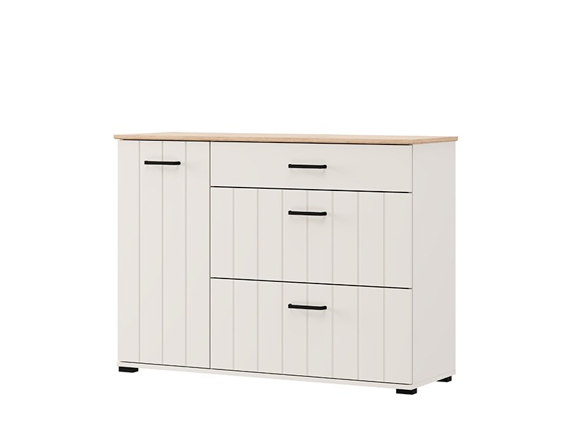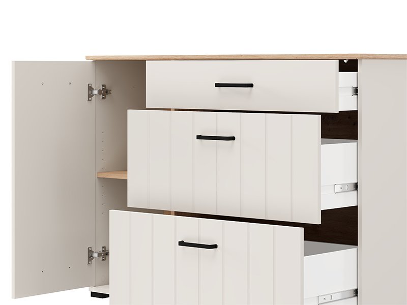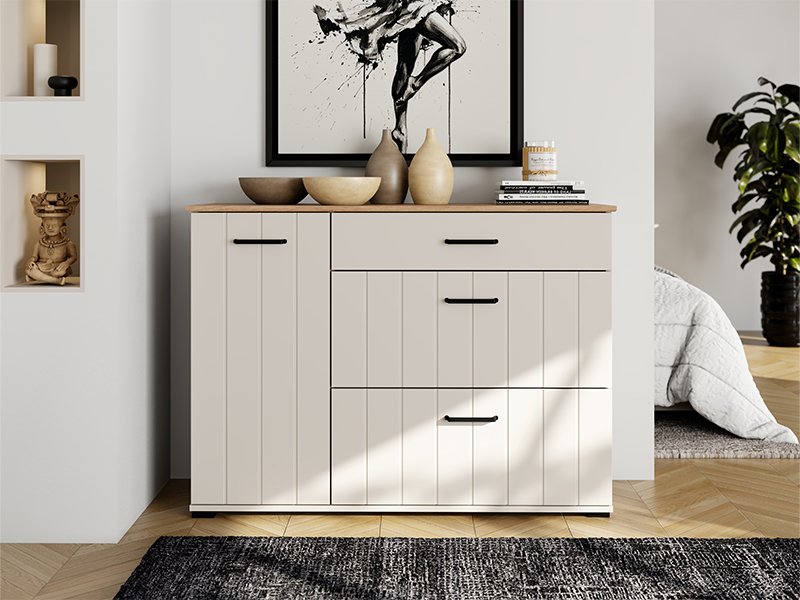 La commode LAMBETH 117 2K3F1V, fabriqué en combinaison des décors cachemire et chêne artisan, contribue à l’aspect chaleureux et rustique de la chambre à coucher, soulignant la ligne de la conception géométrique clairement définie et les rayures en relief sur les façades.