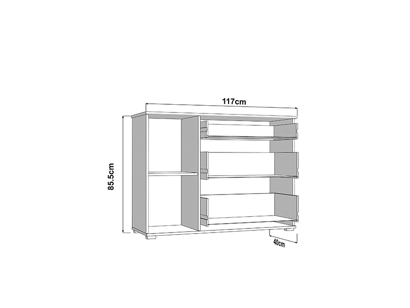 L’espace utilisable de cette commode est organisé de telle manière qu’il comporte un segment cloisonné fermé et trois tiroirs, dont un peu profond, et deux plus profonds, permettant ainsi un rangement bien organisé et pratique des vêtements et des petits objets.