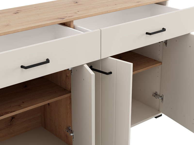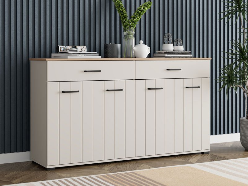 | Komoda LAMBETH 156 4K2F4V u kombinaciji dekora kašmira i artisan hrasta unosi u prostor toplinu i rustičan karakter, zahvaljujući posebnoj završnoj obradi u vidu prugica utisnutih na frontove. Upotrebni prostor čine četiri zatvorena pregradna dela i dve prostrane fioke, koje omogućavaju praktično i organizovano odlaganje različitih predmeta, od dokumentacije i sitnica do dekorativnih detalja. Komoda LAMBETH 156 4K2F4V je deo sistema elemenata LAMBETH, koji odlikuje estetski izražen stil i funkcionalnost. |