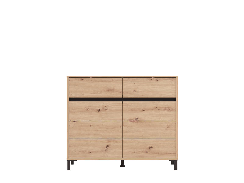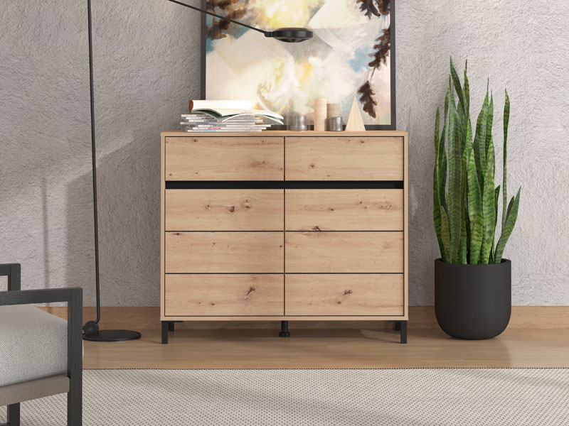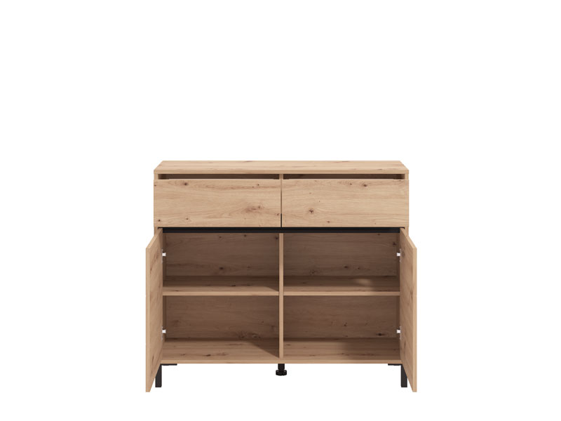 La commode MARRON 106 2K2F2V en combinaison de décor chêne artisan et feuille mate noire est un meuble fonctionnel indispensable dans chaque ambiance de la maison.
