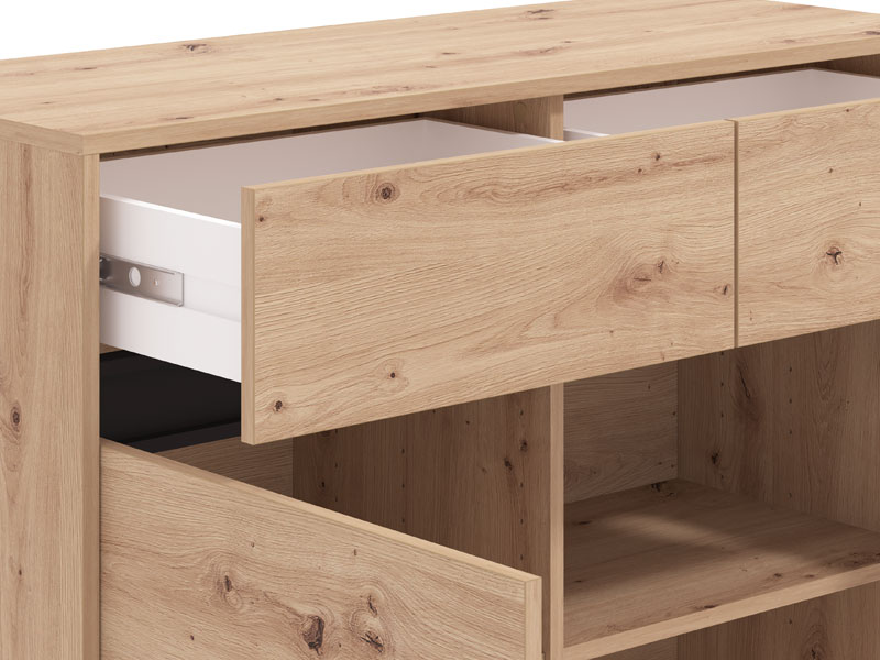 L’espace utilisable très bien aménagé de cette commode se compose de deux segments cloisonnés fermés et de deux tiroirs pratiques.