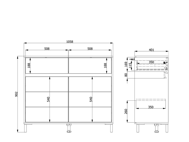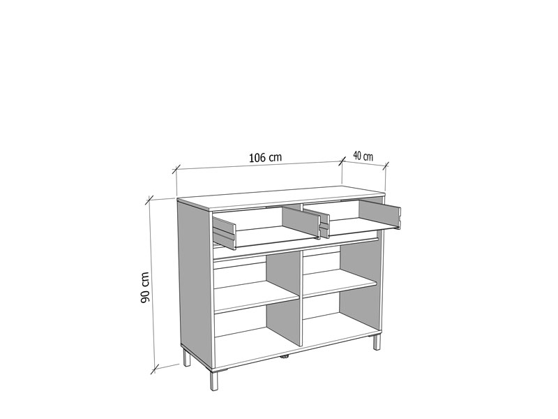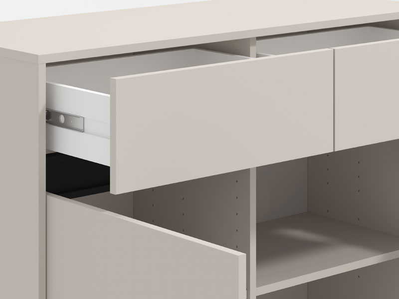 L’espace utilisable très bien aménagé de cette commode se compose de deux segments cloisonnés fermés et de deux tiroirs pratiques.