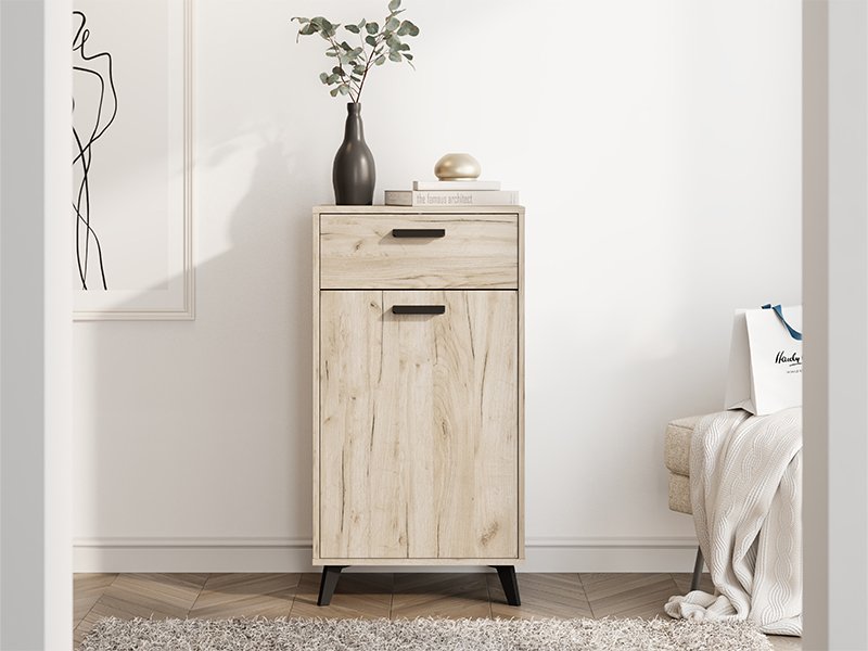 L’élément d’entrée UMBRIA 1K1F, au dessein chêne gris, avec des détails décoratifs fonctionnels noirs, dispose d’un segment fermé pratique pour ranger les chaussures se composant d’un battant avec des étagères et d’un tiroir. Il peut être combiné avec d’autres éléments de la collection pour l’entrée UMRIA qui complètent l'idée d’intérieur de l'entrée de votre maison.
