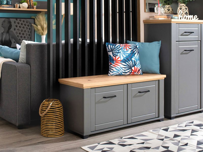 L’élément d’entrée VALENCIA KOM en combinaison chêne artisan, gris graphite et une feuille mate grise apporte une note monochrome plus subtile à l'espace provenant des lignes de conception régulières. Les façades sont enrichies de poignées noires à la conception simple, qui sont coordonnées avec la ligne de conception de l’ensemble de la collection. Il dispose d’un segment fermé pratique pour ranger les chaussures. Il fait partie du système d'éléments du même nom pour l’ameublement de l’ambiance de l’entrée, qui se caractérisent par la fonctionnalité et la praticité à laquelle contribuent à la fois un grand nombre d'éléments du système, ainsi qu’une excellente organisation de l'espace de rangement.