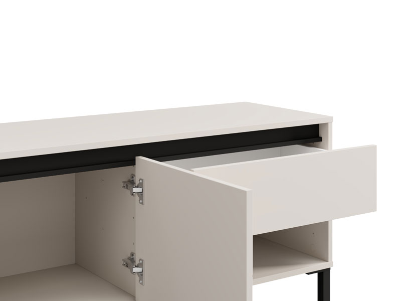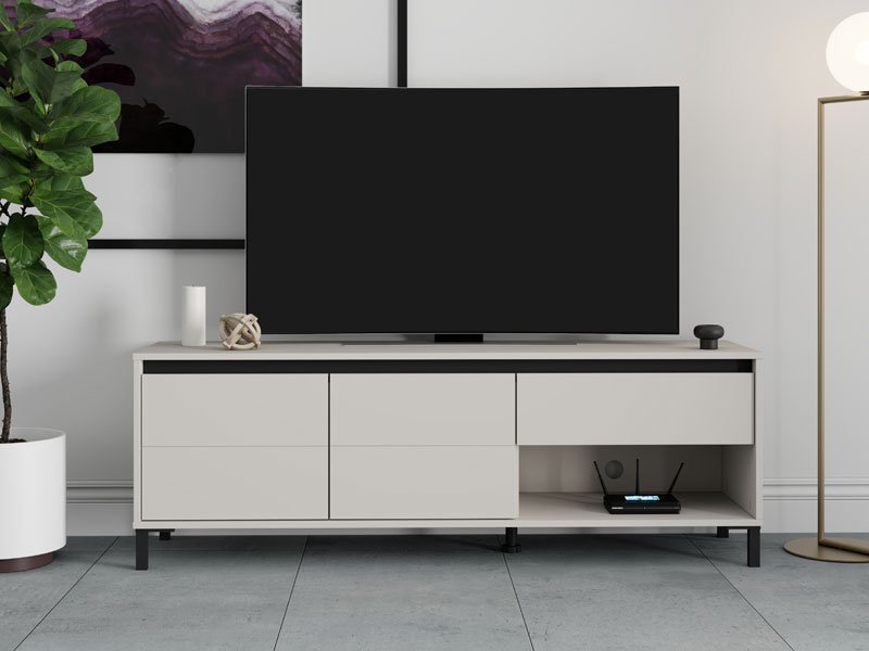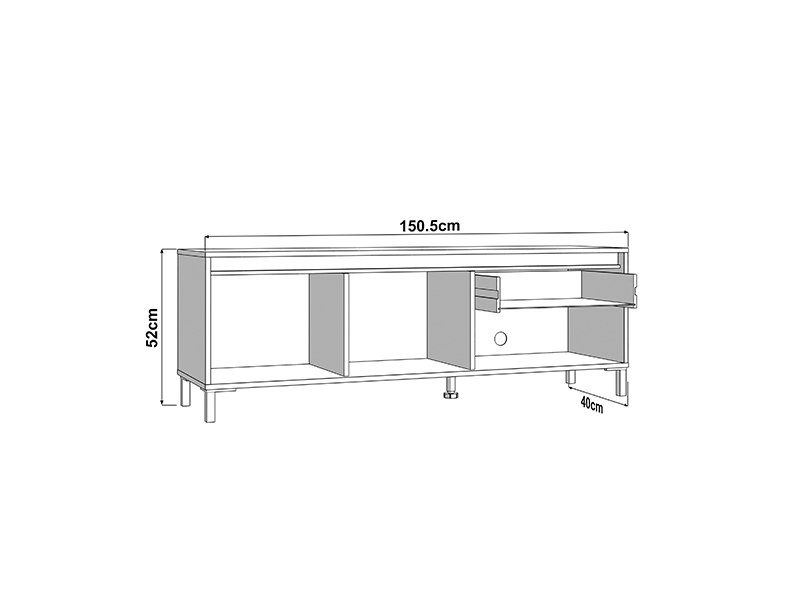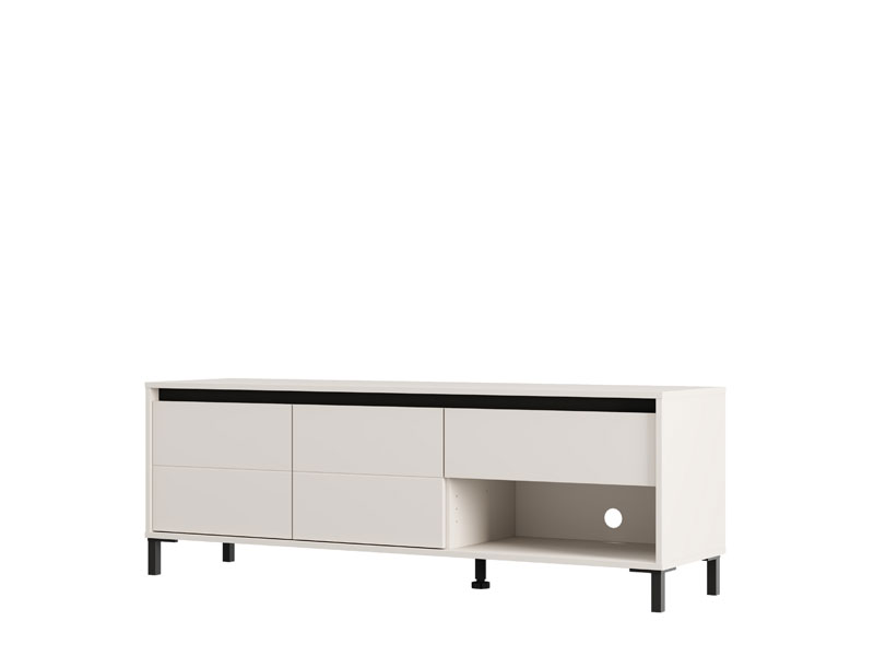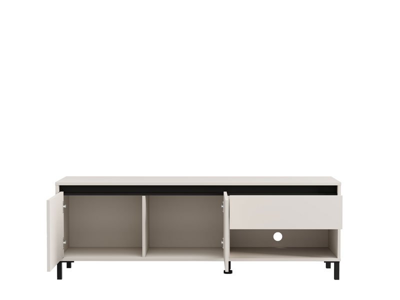 L’étagère à télévision MARRON TV 150 3K1F2V en combinaison du décor cachemire et de la feuille matte noire apporte à l’espace un contraste visuel moderne et une chaleur sophistiquée. Son espace utilisable se compose de deux segments cloisonnés fermés, d’une étagère ouverte et d’un tiroir, permettant un rangement pratique et organisé. L’étagère à télévision MARRON TV 150 3K1F2V fait partie du système d’éléments MARRON, se distinguant par l’harmonie des tons modernes et la fonctionnalité de la conception moderne.