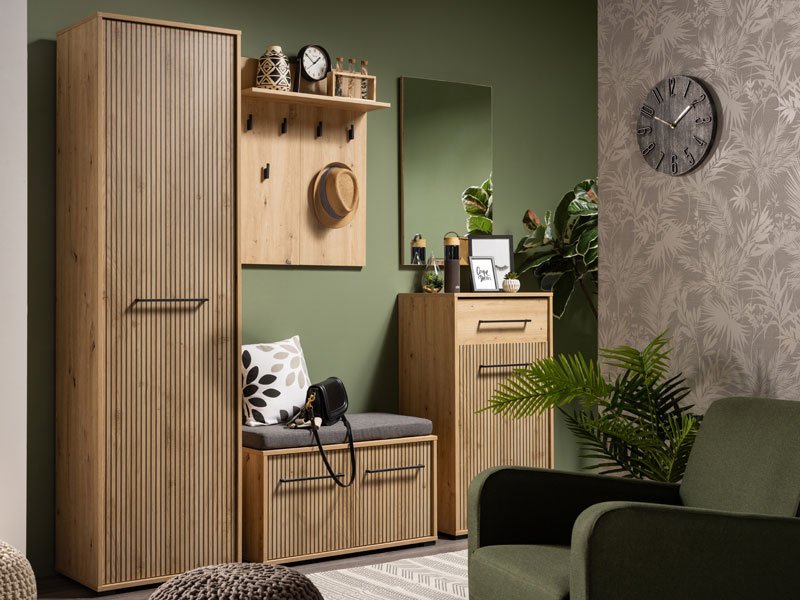 L’élément de couloir LANDES KOM, en combinaison de décor chêne artisan et chêne artisan à rayures, dispose d’un segment double fermé pratique pour ranger les chaussures et d’un coussin pour la surface d’assise au dessein gris. Il peut être combiné avec d’autres éléments de la collection pour l’entrée LANDES qui complètent l'idée d’intérieur de l'entrée de votre maison.