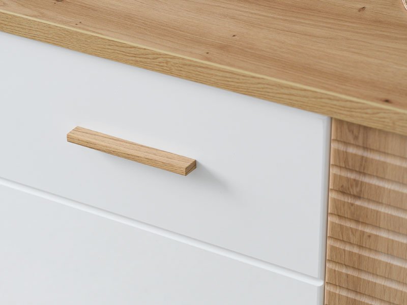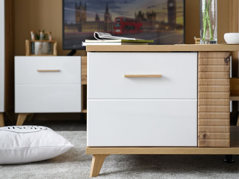 La table basse BRETAGNA est un excellent accessoire fonctionnel pour l’aménagement de l’ambiance du salon. Une combinaison de décor chêne artisan avec de segments au décor de feuille laquée blanche apporte une esthétique rafraîchissante à l’ambiance. Les poignées en bois relient les décors en un ensemble esthétique, tandis que les pieds hauts soulignent leur élégance.