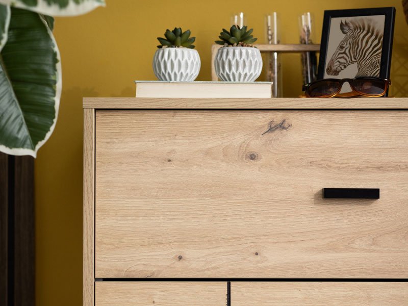 La commode ALERIA 80 3F au décor chêne artisan avec un imprimé, contribue à l’aménagement pratique de la chambre à coucher et grâce à sa conception attrayante qui met en valeur les rayures noires sur le décor en bois, ainsi que les poignées et les pieds noirs assortis, apporte un style moderne à l’ambiance de la chambre à coucher.