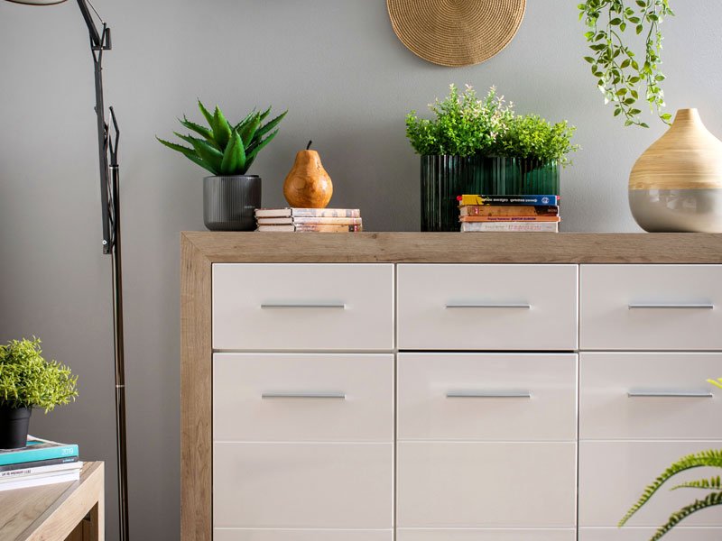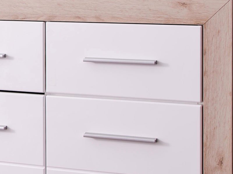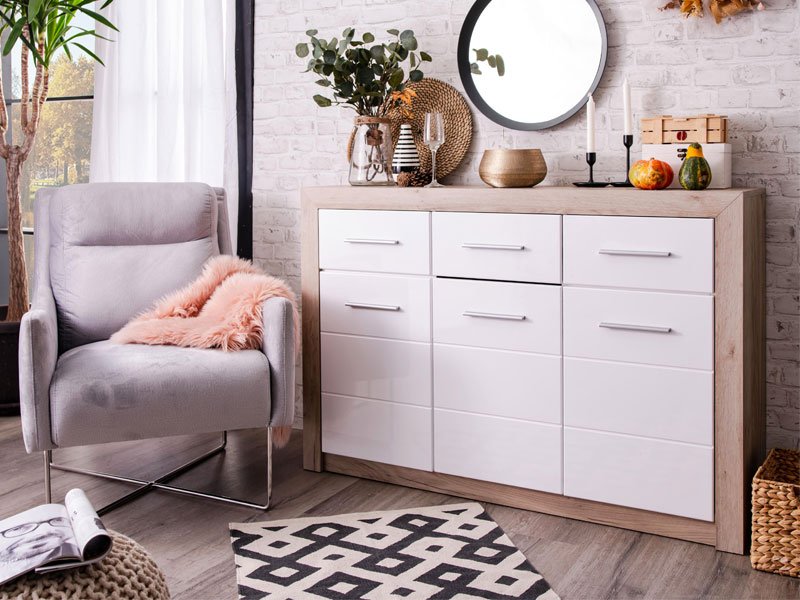 La commode ETNA 3K3F, avec une combinaison de corps au décor chêne gris et les façades revêtues de la feuille laquée blanche, dispose de trois segments pratiques avec des étagères de séparation et trois tiroirs. Grâce à sa conception, la commode ETNA 3K3F est compatible avec différents modèles de meubles destinés à meubler un salon, une chambre ou une entrée.