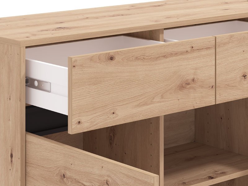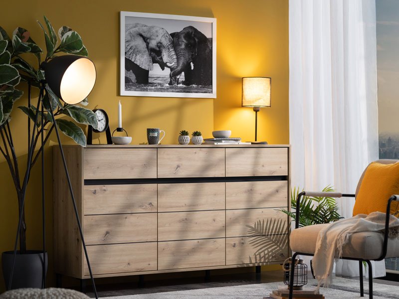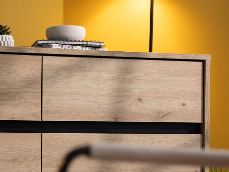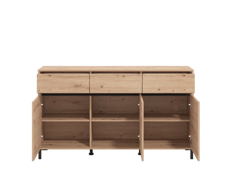 La commode MARRON 157 3K3F3V en combinaison de décor chêne artisan et feuille mate noire est un meuble fonctionnel indispensable dans chaque ambiance de la maison.
