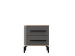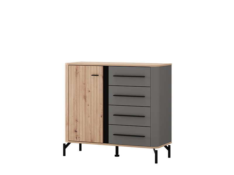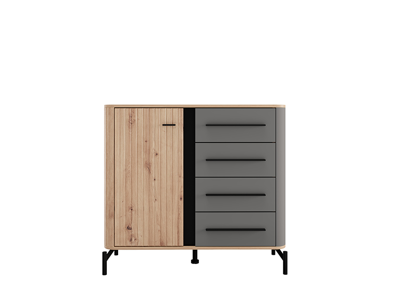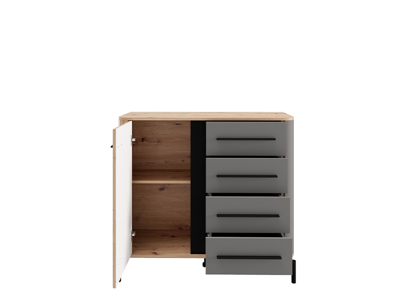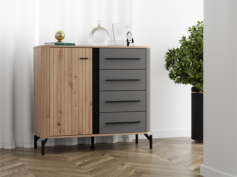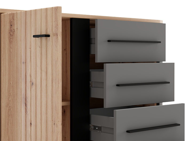 "La commode SINOP 103 2K4F1V, fabriquée en combinaison du décor chêne artisan, de la feuille chêne artisan, des décors gris graphite et bois noir, contribue à l’aspect moderne et élégant de la chambre à coucher, soulignant le contraste et la ligne de la conception géométrique clairement définie.