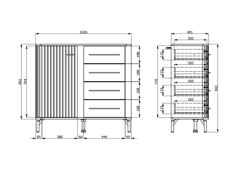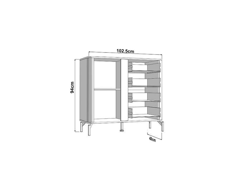 L’espace utilisable de cette commode se compose d’un segment cloisonné fermé et de quatre tiroirs, permettant un rangement clair et pratique des vêtements et d’autres objets, ce qui améliore la fonctionnalité et l’organisation de l’espace.
