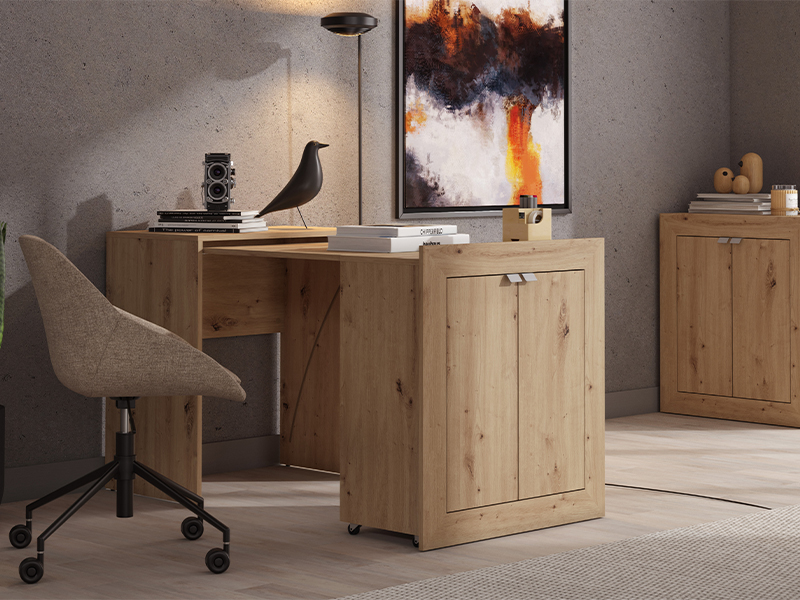 La table d'ordinateur EUDOX, au décor chêne artisan, est un meuble multifonctionnel qui combine une commode et une table d'ordinateur. Un segment de la commode peut être tiré grâce à ses roulettes, offrant ainsi un plan de travail supplémentaire rapidement et facilement. Ce système pratique permet une utilisation efficace de l’espace et une adaptation facile aux différents besoins. Grâce à sa conception fonctionnelle et à son décor chêne artisan chaleureux, la table EUDOX est un excellent choix pour l’organisation de l’espace de travail avec style et confort.