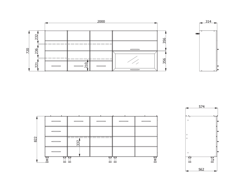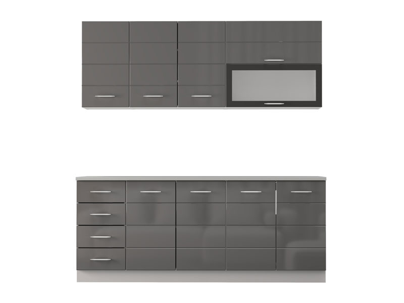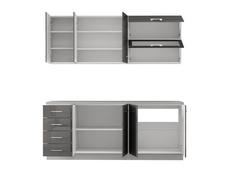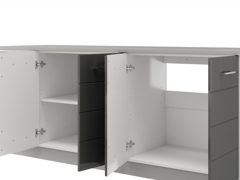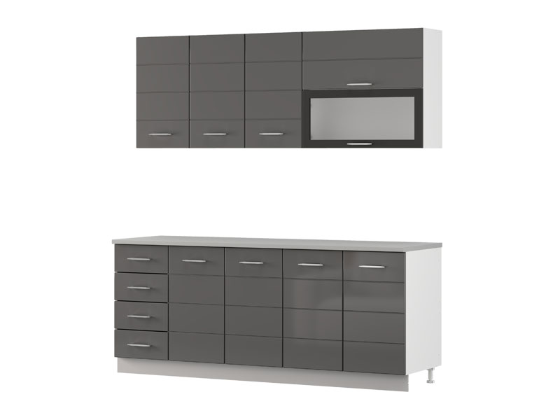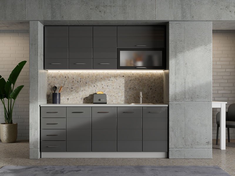 La cuisine UNA 200, en combinaison du décor blanc opaque et de la feuille laquée grise, est une solution élégante et fonctionnelle pour les espaces de cuisine modernes. Ses éléments agencés de manière pratique permettent une organisation efficace et un rangement facile des ustensiles de cuisine, tandis que sa conception minimaliste, aux lignes épurées et aux tons neutres, contribue à une ambiance lumineuse et ordonnée. La cuisine est livrée sans plan de travail, évier, ni plinthe, et la profondeur totale, y compris le plan de travail, est de 60 cm, ce qui permet une planification rationnelle de l’espace et une utilisation quotidienne pratique.