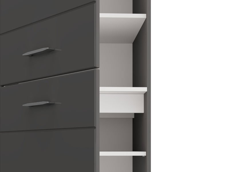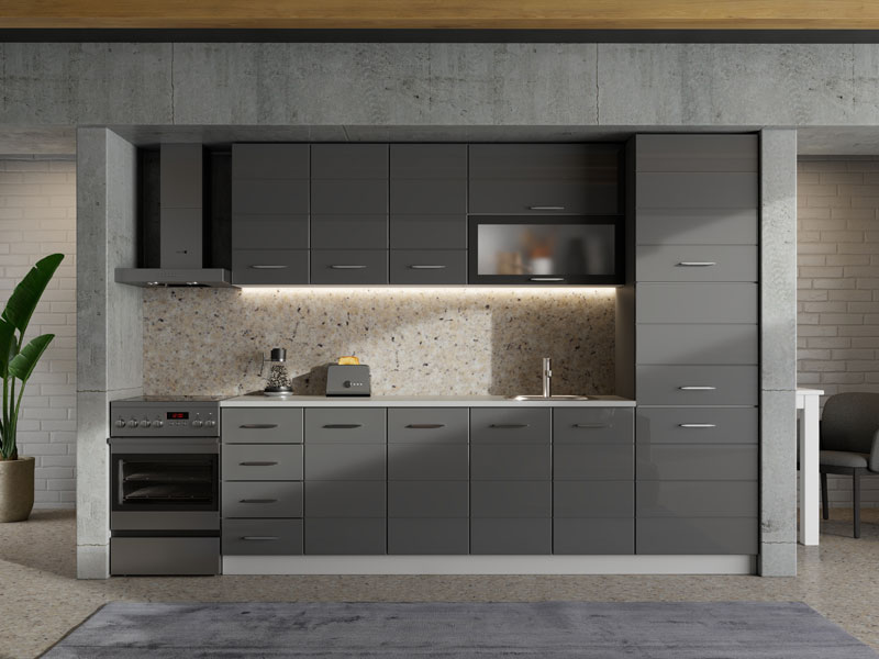 L’élément de cuisine DRINA BD 60 UR, en combinaison du décor gris graphite et de la feuille laquée grise, est destiné au rangement ou à l’installation d’appareils électroménagers et est une solution pratique pour une organisation optimale de l’espace de cuisine. Sa conception minimaliste, aux lignes épurées et aux tons neutres, permet une intégration harmonieuse avec la cuisine UNA 200, contribuant ainsi à la fonctionnalité et à l’aspect élégant et ordonné de l’ensemble de l’espace.