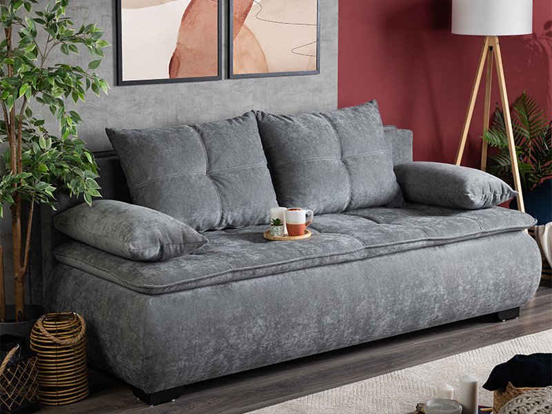 Nom exact du motif : siège/dossier/grand coussin/petit coussin, étoffe WIND 89 gris foncé. Le canapé-lit MINA en plus de sa conception et de son étoffe très attrayants et modernes, il dispose des caractéristiques d’utilisation très pratiques et répond pleinement aux besoins d’un espace de vie moderne. Le coffre de rangement de la literie contribue à sa fonctionnalité, tandis que la surface utile de repos et de couchage de 150x198 cm apportent un confort supplémentaire à ce modèle de canapé-lit.