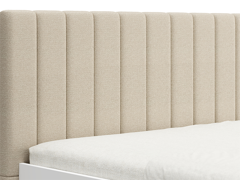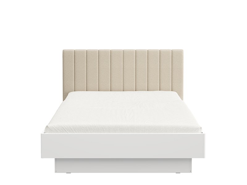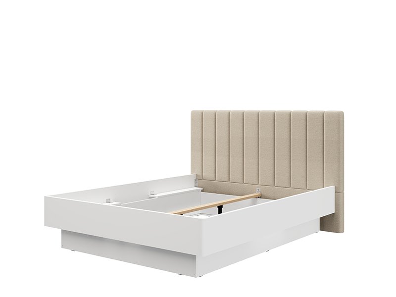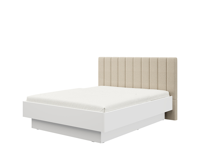 "Le lit double ABERDEEN 180, fabriqué en combinaison du décor blanc opaque avec la tête de lit rembourré beige, contribue à l’aspect moderne et élégant de la chambre à coucher, tout en soulignant le contraste des matériaux et la forme géométrique précise de la conception.