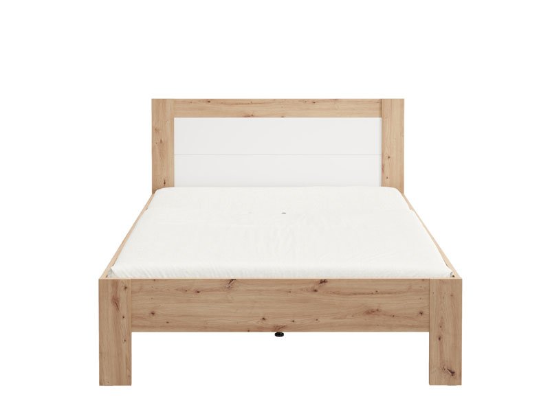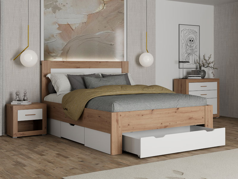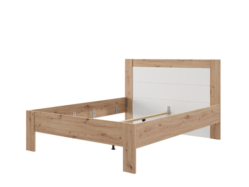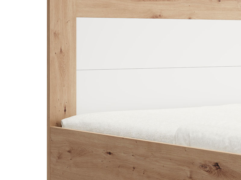Le lit double CARTENA 160, fabriqué en combinaison des décors blanc opaque, chêne artisan et de la feuille chêne artisan, contribue à l’aspect moderne et élégant de la chambre à coucher, tout en soulignant le contraste des matériaux et la forme géométrique précise de la conception.