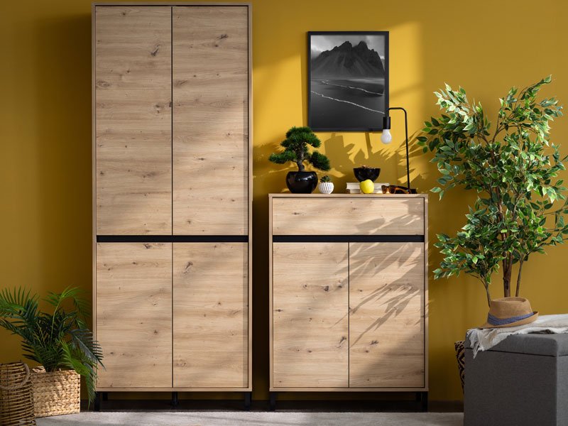 Le meuble à chaussures FLANNAN 2K4V, au décor chêne artisan et des détails en feuille mate noire, constitue une solution moderne et fonctionnelle pour rangement des chausseurs, qui peut également s’intégrer dans des couloirs plus petits et conviendra à tous les styles de décoration intérieure. Ce qui distingue ce modèle de meuble à chaussures, c’est sa fonctionnalité. Il dispose de 2 segments fermés à double battant avec des étagères pour ranger les chaussures.