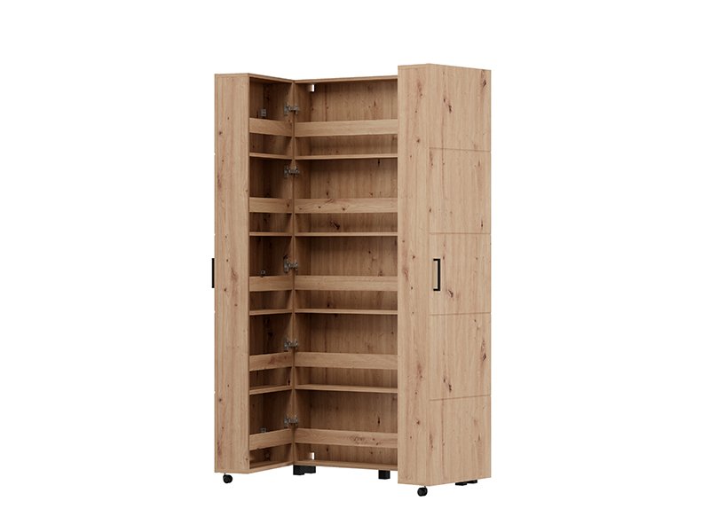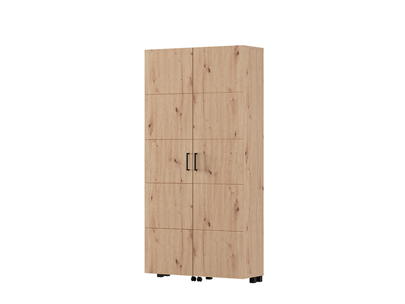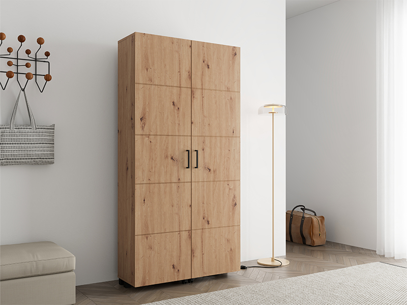 Le meuble à chaussures ISLAY 91 2K h185, au décor chêne artisan avec des rayures marquées à chaud sur la façade, est une solution pratique et élégante pour le couloir. L’intérieur de ce meuble à chaussures à double battant avec des étagères fermées permet une organisation fonctionnelle et rangée des chaussures.