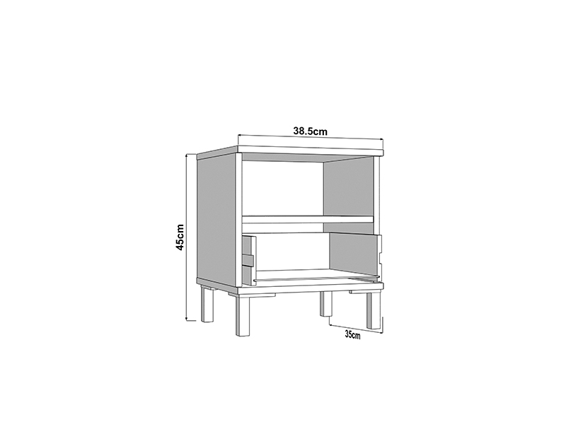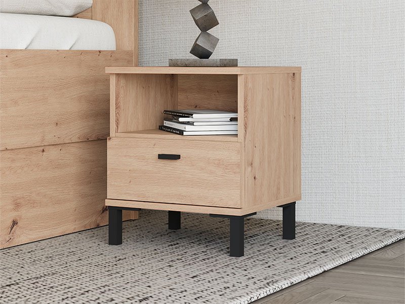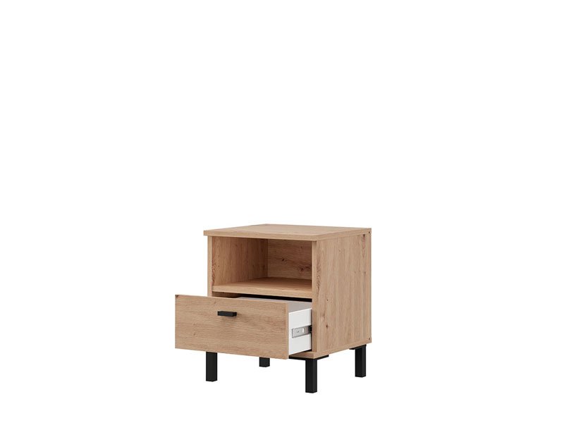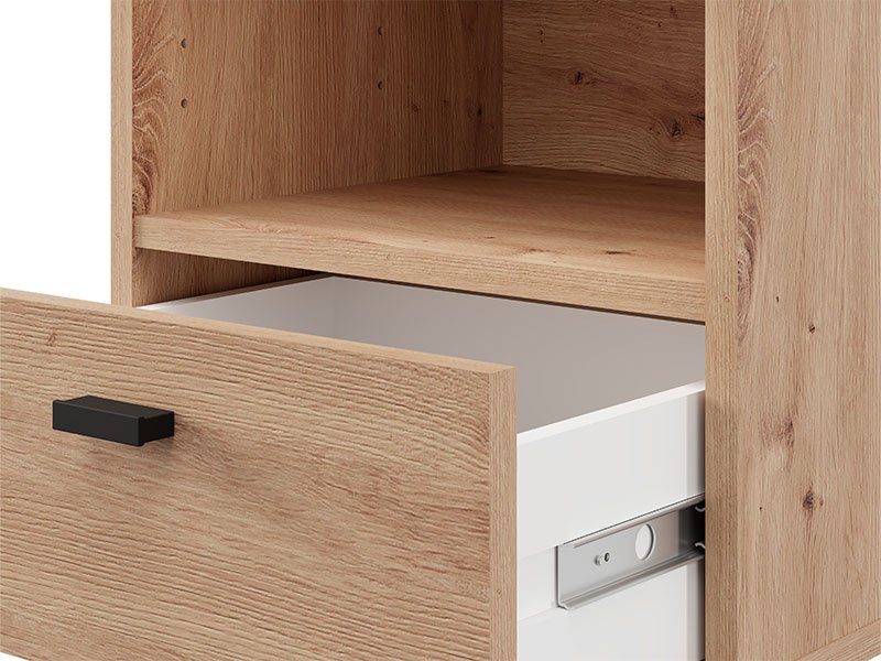 La table de nuit BITINIA NO1F, fabriquée en combinaison des décors chêne artisan et bois noir, contribue à l’aspect chaleureux et moderne de la chambre à coucher, tout en offrant un espace fonctionnel et bien organisé à côté du lit. L’espace utilisable de cette table de nuit se compose d’un tiroir et d’une étagère ouverte, permettant un rangement pratique des petits objets et des articles du quotidien.