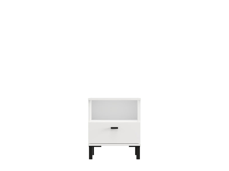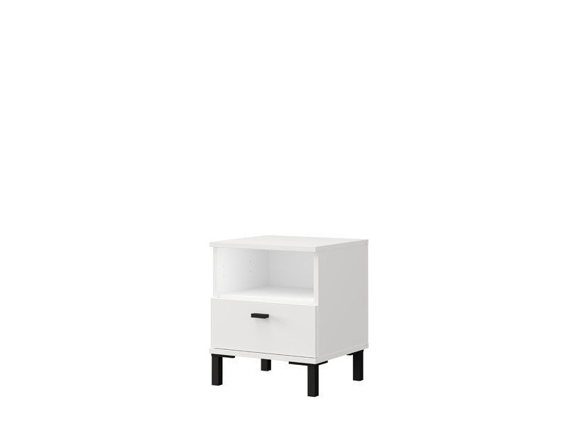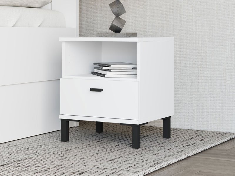 La table de nuit BITINIA NO1F, fabriquée en combinaison des décors blanc opaque et bois noir, contribue à l’aspect moderne et élégant de la chambre à coucher, offrant à la fois un espace fonctionnel et bien organisé à côté du lit.