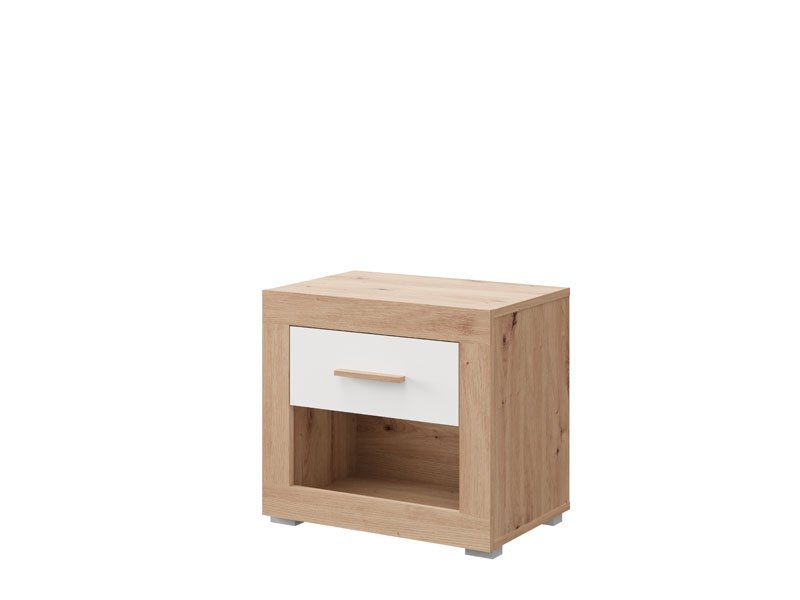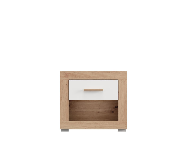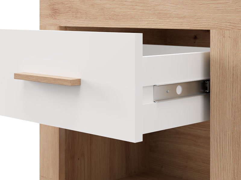 La table de nuit CARTENA NO1F, fabriquée en combinaison des décors blanc opaque, chêne artisan et de la feuille chêne artisan, contribue à l’aspect moderne et élégant de la chambre à coucher, offrant à la fois un espace fonctionnel et bien organisé à côté du lit.